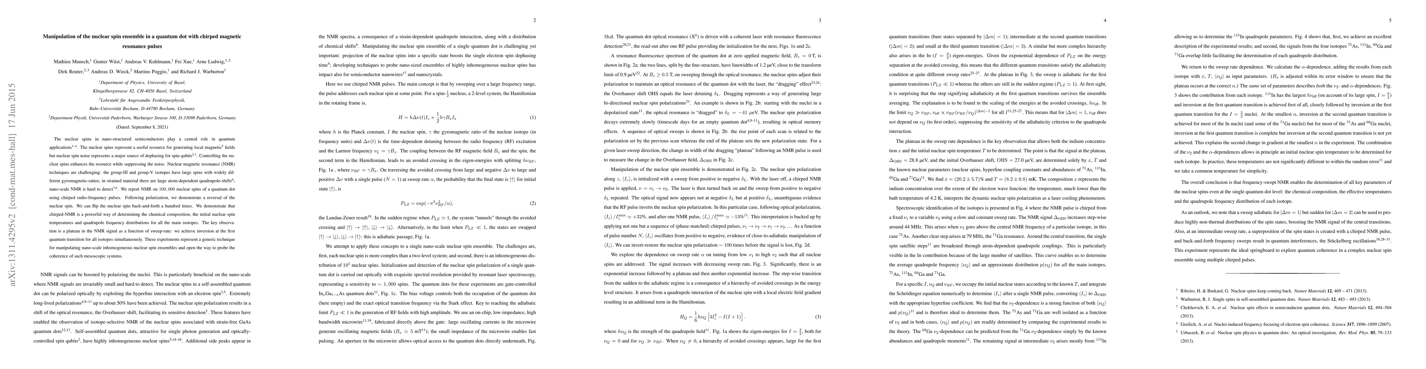 This paper reports on the manipulation of nuclear spin ensembles in a quantum dot using chirped magnetic resonance pulses, demonstrating the ability to reverse nuclear spin polarization and achieve inversion at the first quantum transition for all isotopes simultaneously, thus offering a powerful method for determining chemical composition and coherence in nanoscale systems.