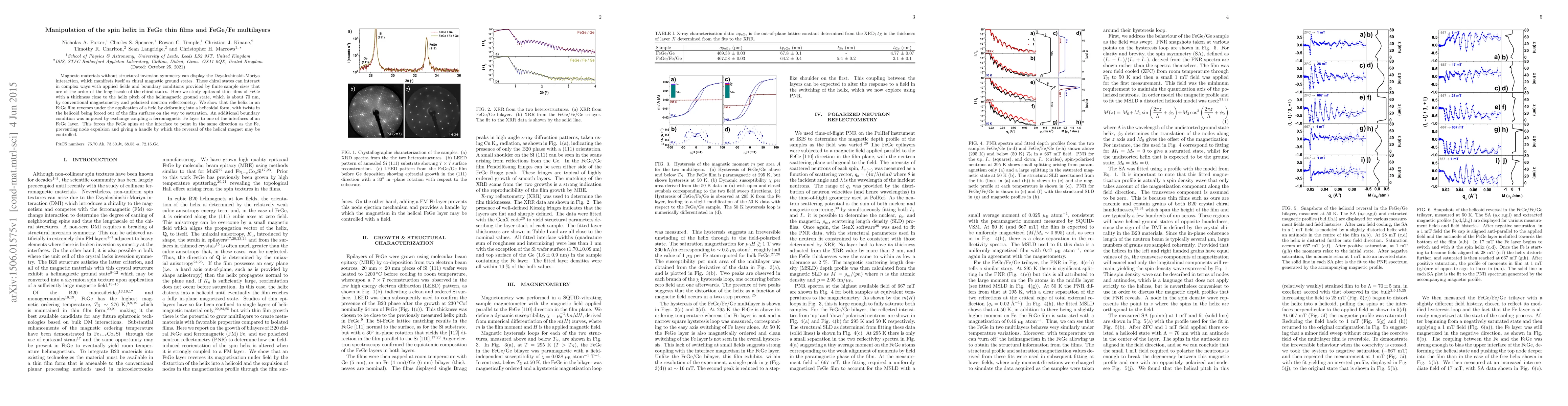 This study investigates the manipulation of the spin helix in FeGe thin films and multilayers, revealing that the helix can reverse under an applied field, transforming into a helicoidal form. Exchange coupling with a ferromagnetic Fe layer at the interface provides a method to control the helical magnet's reversal by aligning the FeGe spins with the Fe layer.