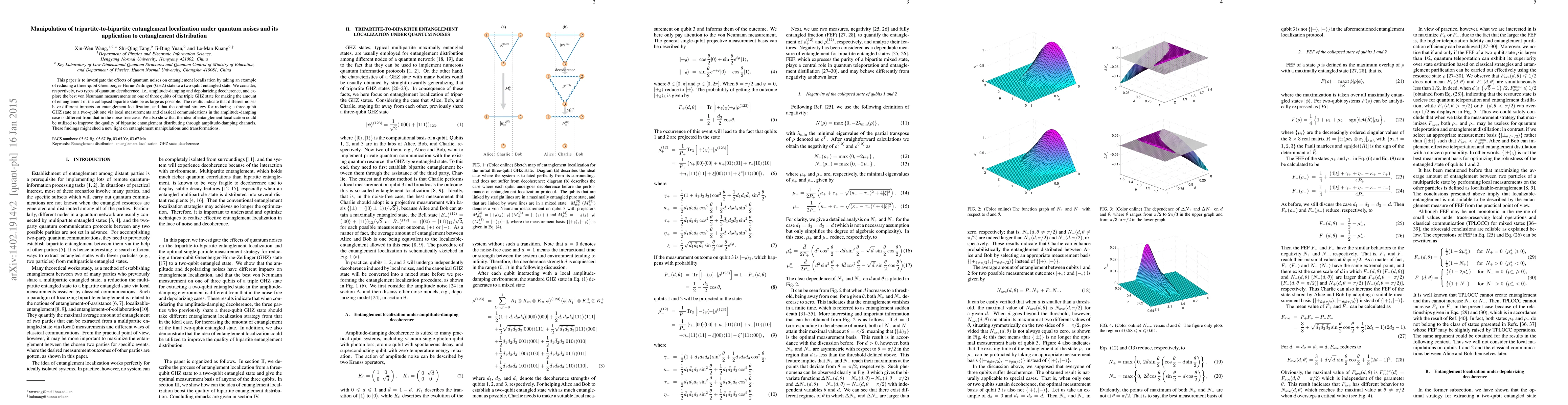 This paper explores how quantum noises affect the localization of tripartite entanglement, specifically transforming a three-qubit GHZ state into a two-qubit entangled state. It finds that different noise types impact entanglement localization differently, and proposes optimal measurement strategies for maximizing bipartite entanglement under various decoherence conditions.