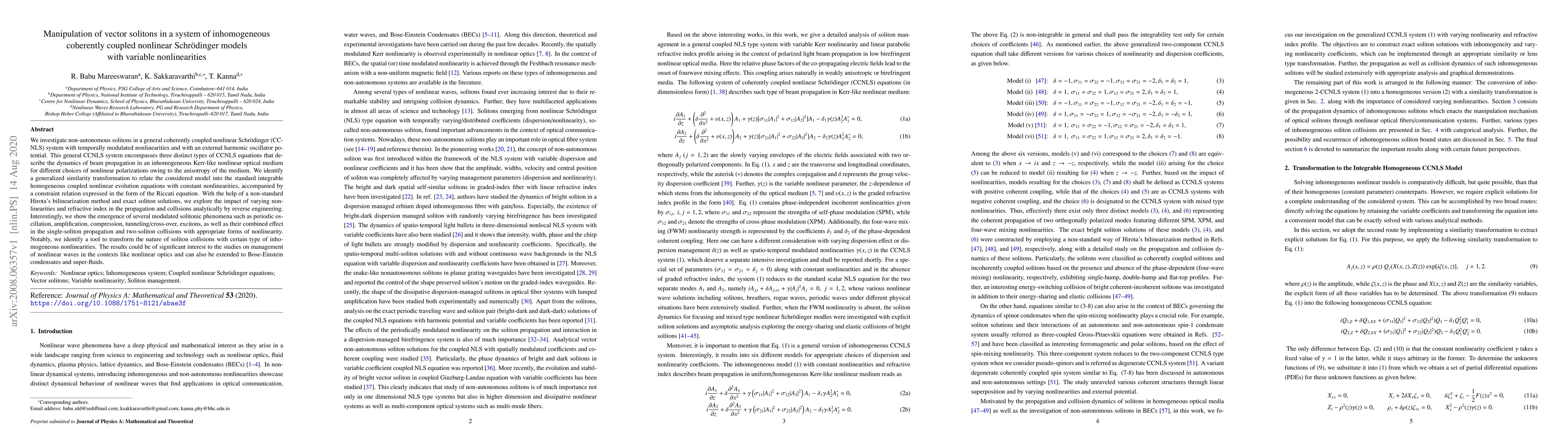 This paper explores non-autonomous solitons in a coherently coupled nonlinear Schrödinger system with variable nonlinearities and an external potential, identifying a generalized similarity transformation to analyze their dynamics. It reveals various modulated soliton phenomena and proposes a method to manipulate soliton interactions, with implications for nonlinear optics and quantum systems.