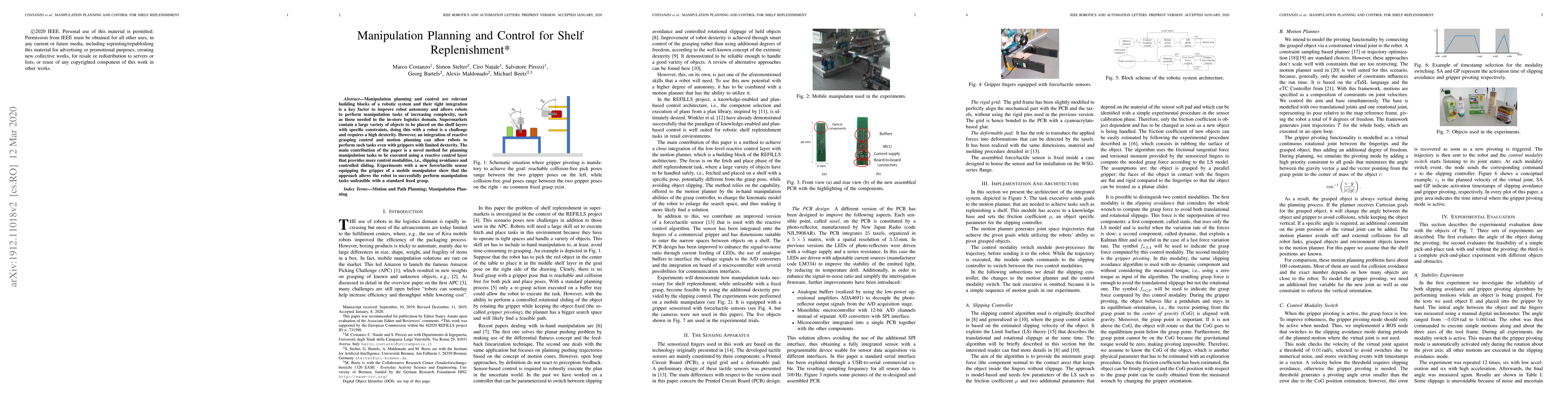 This paper presents a novel method for planning manipulation tasks in supermarket shelf replenishment using a reactive control layer that enhances dexterity through slipping avoidance and controlled sliding. Experiments demonstrate the robot's success in performing complex tasks with a mobile manipulator equipped with a new force/tactile sensor.