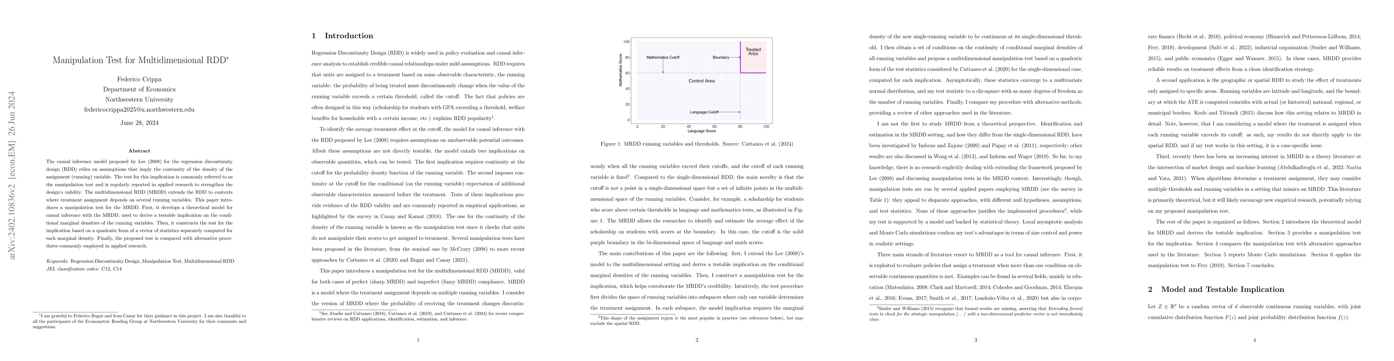 This paper introduces a manipulation test for the multidimensional regression discontinuity design (MRDD), extending the Lee (2008) model's assumptions to contexts with multiple running variables. It proposes a test based on the conditional marginal densities of these variables and compares it with existing methods.