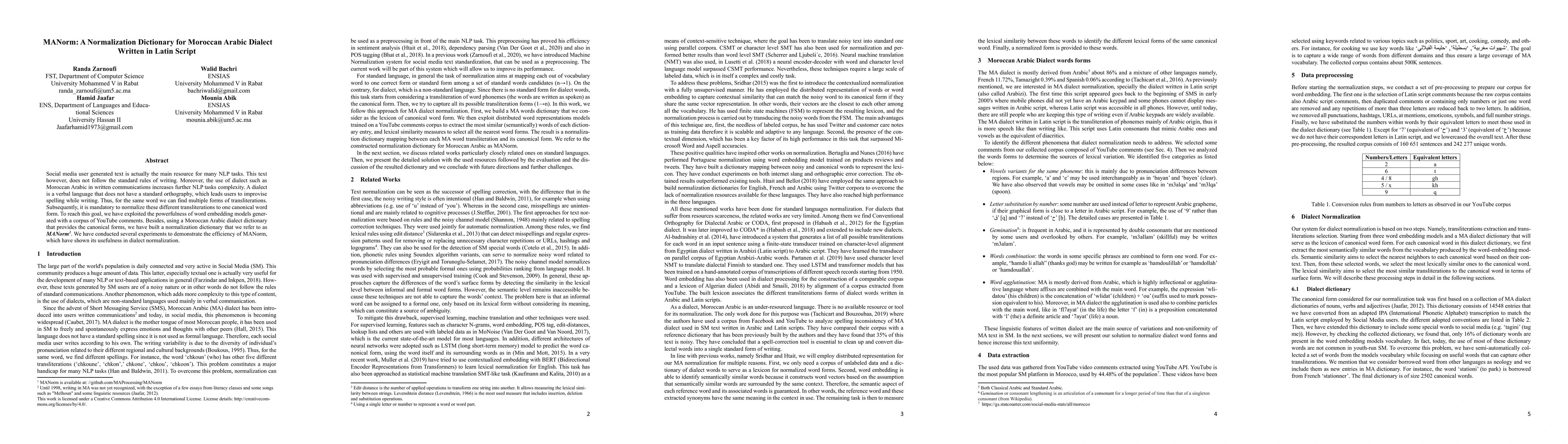 Title: MANorm: A Normalization Dictionary for Moroccan Arabic Dialect Written in Latin Script Summary: This paper presents MANorm, a normalization dictionary developed to standardize various transliterations of Moroccan Arabic dialect in Latin script, using word embeddings from YouTube comments and a dialect dictionary. Experiments confirm its effectiveness in dialect normalization tasks.