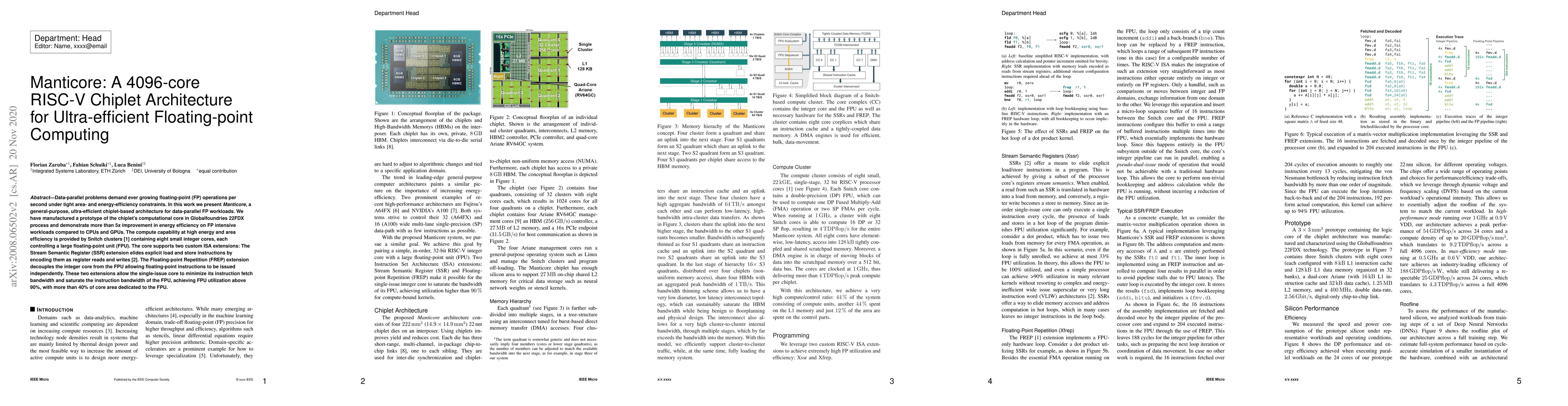 Manticore is a 4096-core RISC-V chiplet architecture designed for ultra-efficient data-parallel floating-point computing, achieving over 5x improvement in energy efficiency compared to CPUs and GPUs. It utilizes Snitch clusters with custom ISA extensions to maximize FPU utilization and minimize instruction fetch bandwidth.
