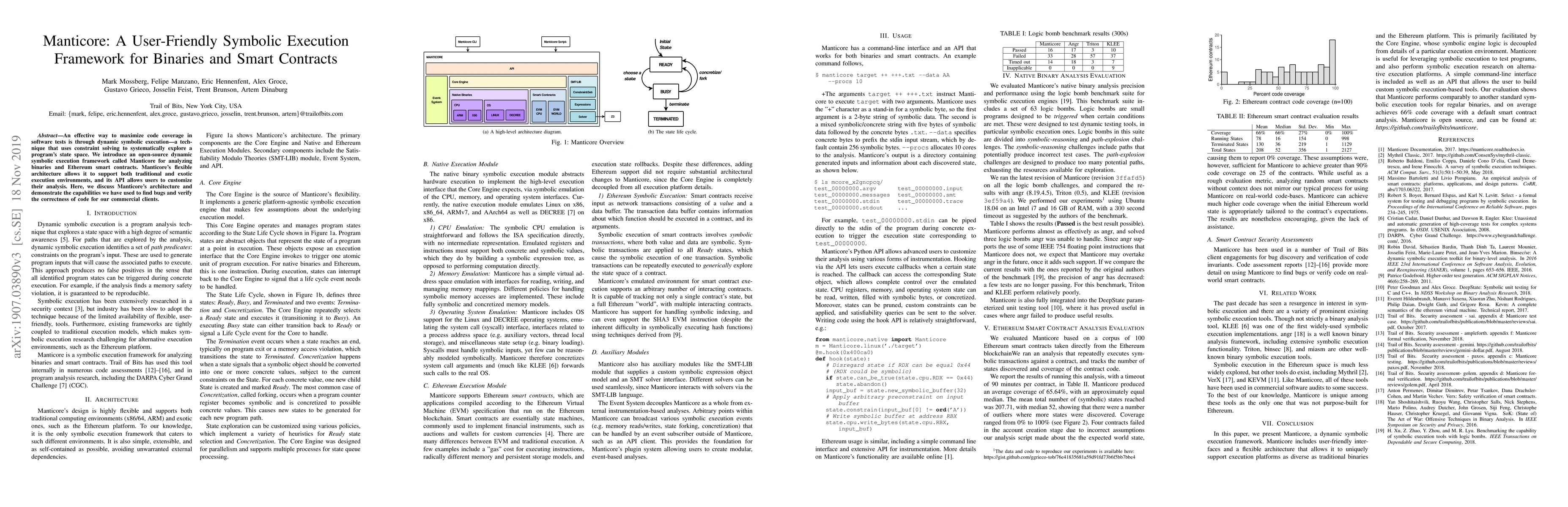 **Summary:** Manticore is an open-source dynamic symbolic execution framework designed to maximize code coverage for binaries and Ethereum smart contracts through constraint solving. Its flexible architecture supports diverse execution environments, and its API enables customizable analysis for bug detection and code verification.