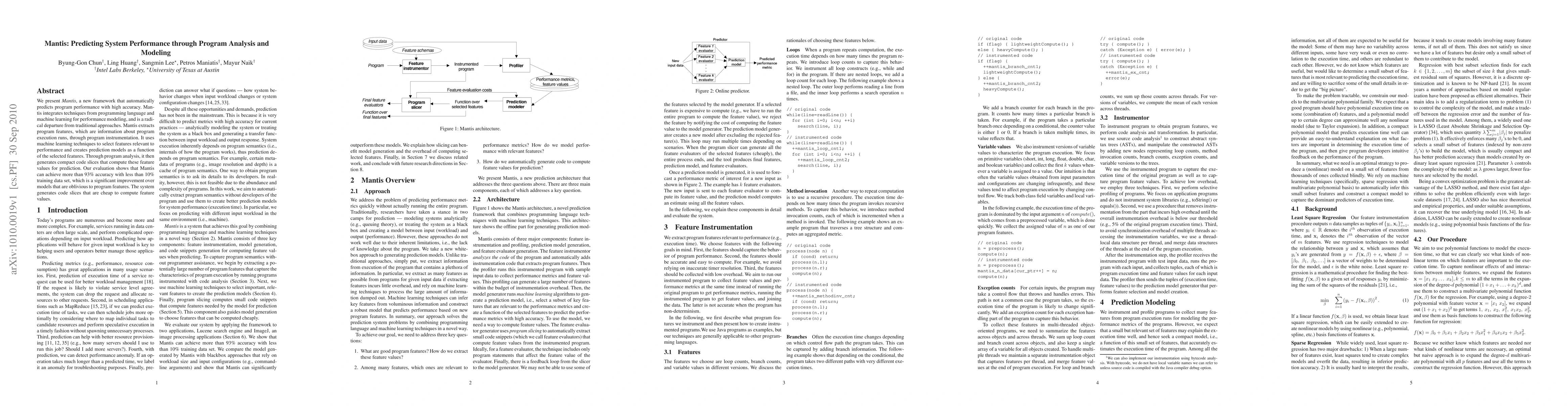 Mantis is a novel framework for high-accuracy program performance prediction, leveraging program analysis and machine learning to model performance based on extracted program features. It achieves over 93% accuracy with minimal training data, significantly outperforming traditional methods.