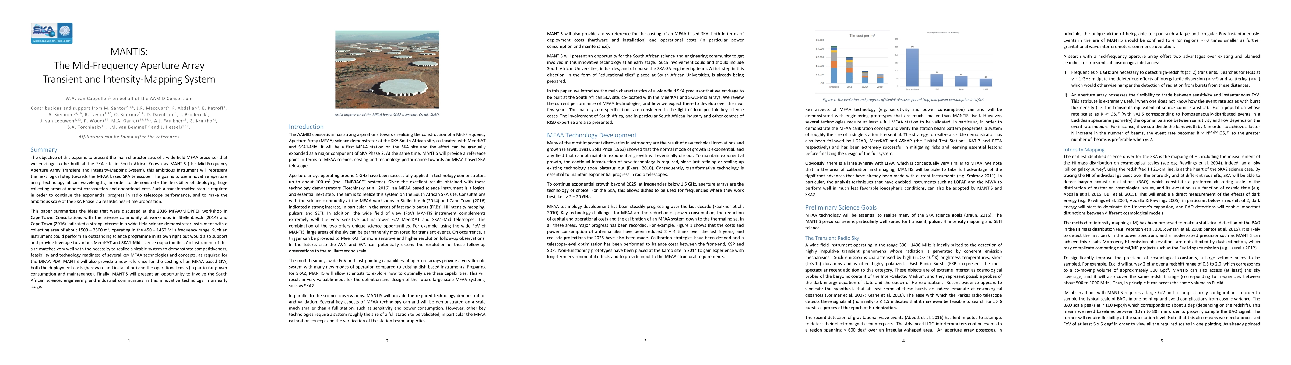 The paper introduces MANTIS, a precursor to the Mid-Frequency Aperture Array (MFAA) for the SKA telescope in South Africa, aiming to demonstrate the feasibility of large collecting areas using innovative aperture array technology at cm wavelengths. The goal is to enable significant advancements in radio telescope performance at a manageable cost.
