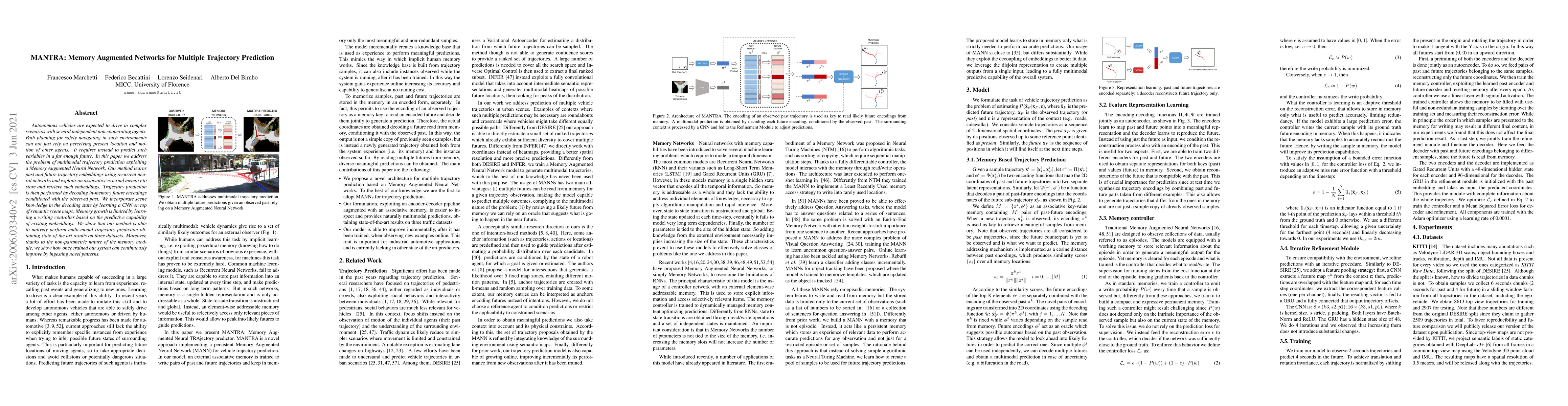 Researchers developed a Memory Augmented Neural Network to predict trajectories of multiple autonomous vehicles in complex environments, achieving state-of-the-art results on three datasets. The method learns past and future trajectory embeddings using recurrent neural networks and an associative external memory.