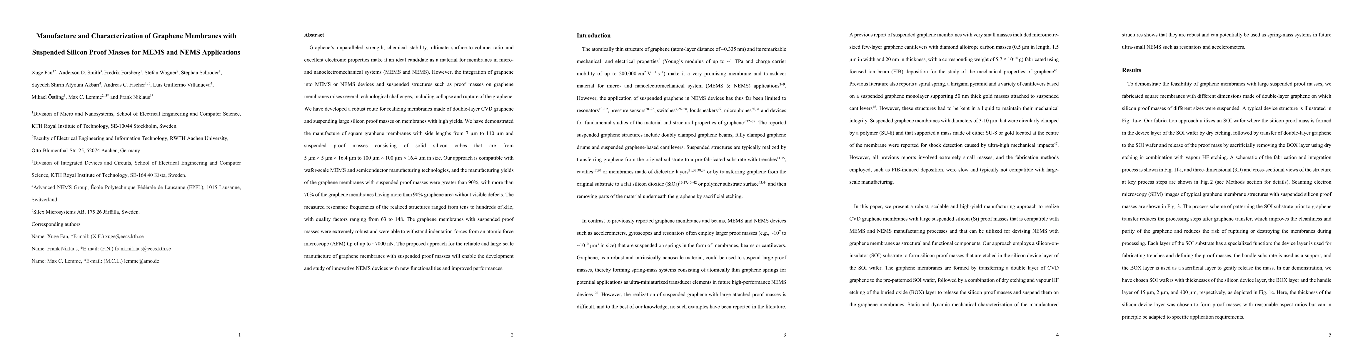 This paper details a method for manufacturing graphene membranes with suspended silicon proof masses, showcasing a high yield of over 90%. The graphene membranes, ranging from 7 to 110 micrometers, were shown to be robust and capable of withstanding significant forces, facilitating the development of advanced NEMS devices.