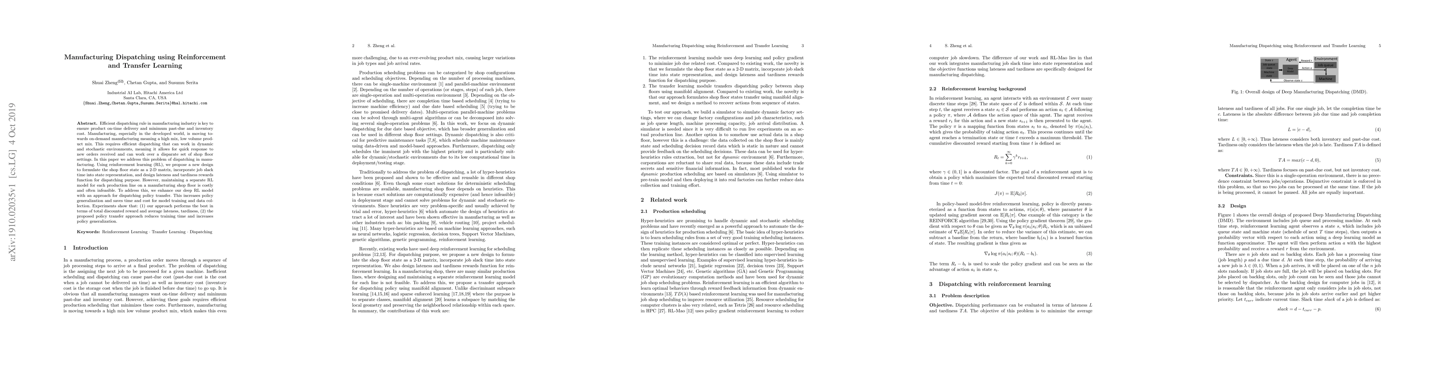 This paper proposes a reinforcement learning approach to optimize manufacturing dispatching in dynamic environments, incorporating job slack time and reward functions for lateness and tardiness. To enhance efficiency and reduce costs, it introduces a transfer learning method for policy generalization across different production lines, demonstrating improved performance and reduced training time.