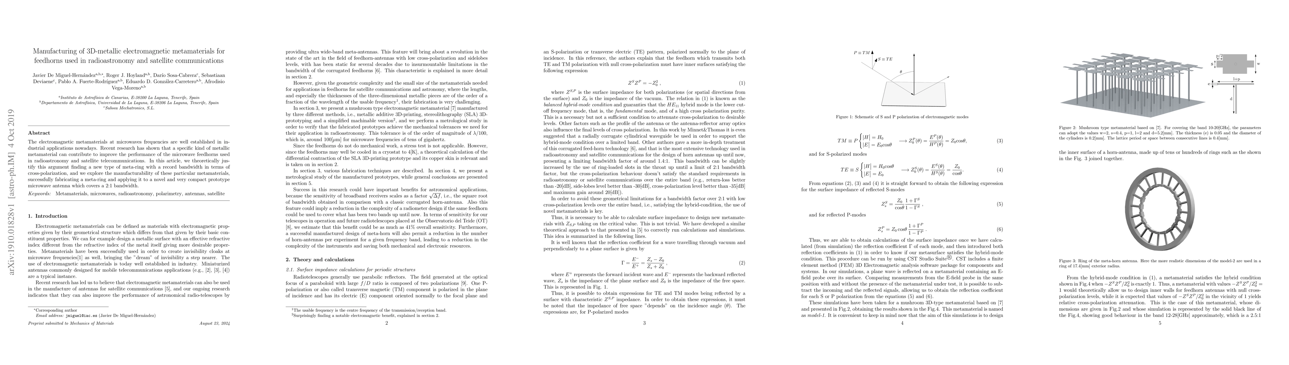 The electromagnetic metamaterials at microwaves frequencies are well established in industrial applications nowadays. Recent research has shown that a specific kind of metallic metamaterial can contribute to improve the performance of the microwave feedhorns used in radioastronomy and satellite telecommunications. In this article, we theoretically justify this argument finding a new type of meta-ring with a record bandwidth in terms of cross-polarization, and we explore the manufacturability of these particular metamaterials, successfully fabricating a meta-ring and applying it to a novel and very compact prototype microwave antenna which covers a 2:1 bandwidth.