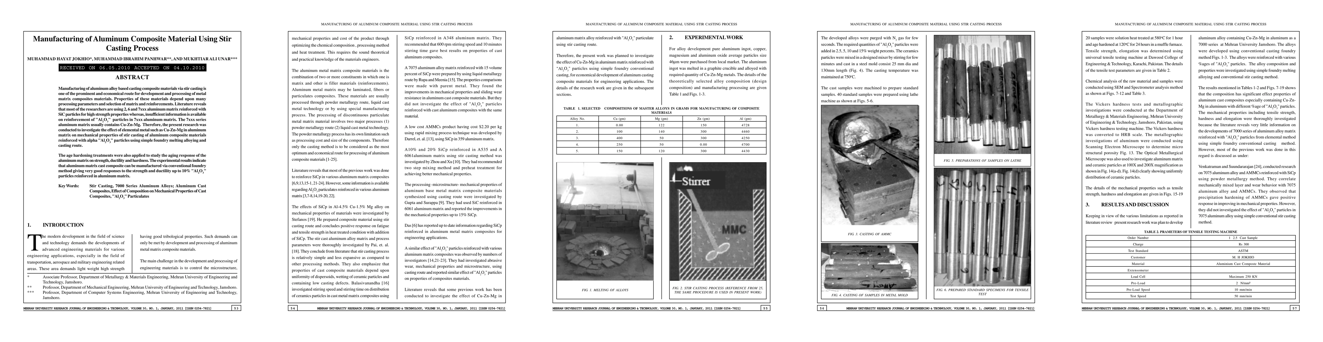 This research investigates the manufacturing of aluminum alloy composites using stir casting, focusing on the 7xxx aluminum matrix reinforced with Al2O3 particles. The study explores the impact of Cu-Zn-Mg elements on mechanical properties and finds that composites with up to 10% Al2O3 reinforcement show improved strength and ductility, with age hardening treatments enhancing these properties.