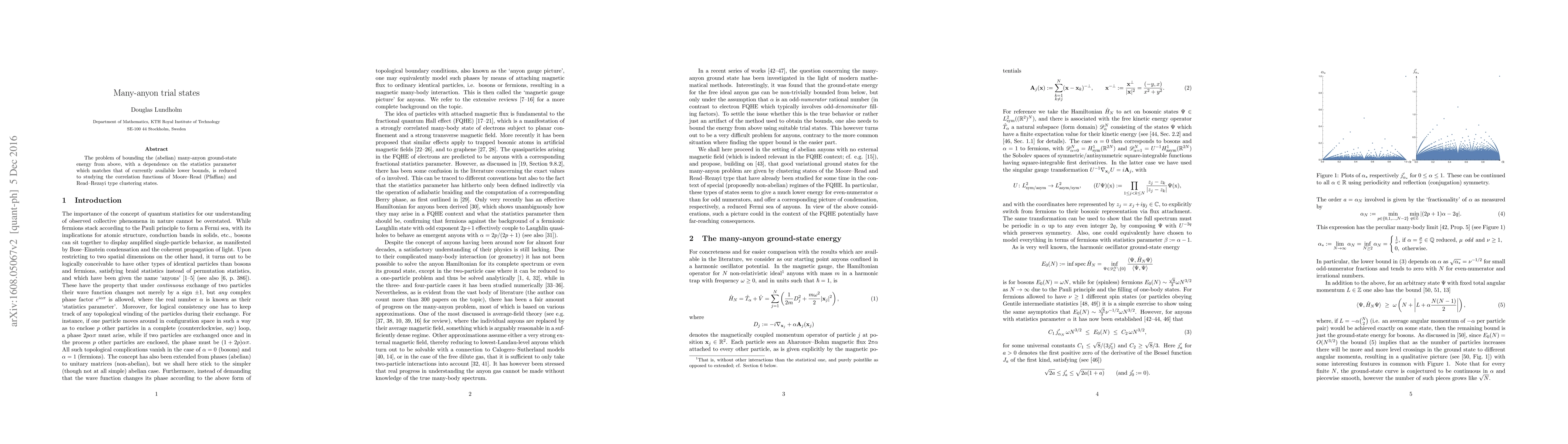 The problem of bounding the (abelian) many-anyon ground-state energy from above, with a dependence on the statistics parameter which matches that of currently available lower bounds, is reduced to studying the correlation functions of Moore-Read (Pfaffian) and Read-Rezayi type clustering states.