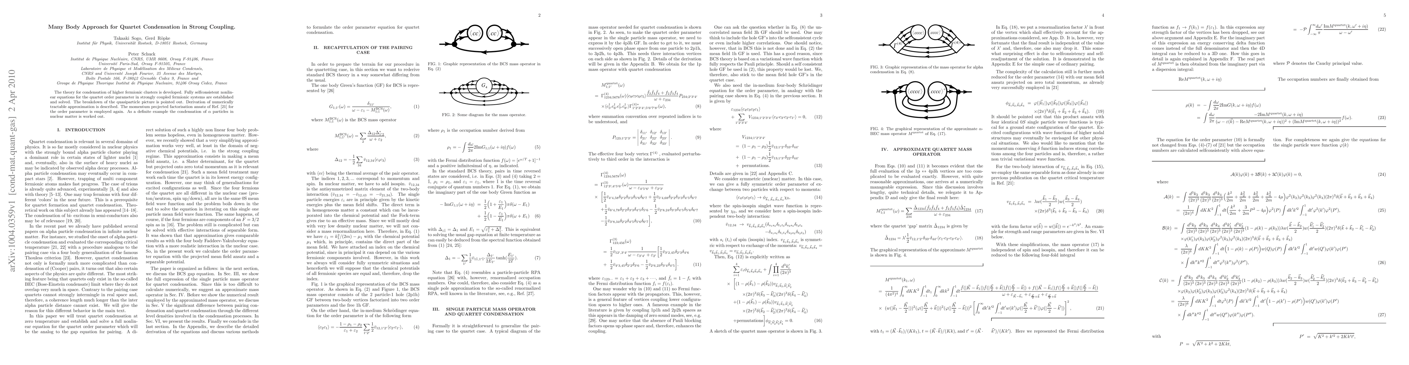 The theory for condensation of higher fermionic clusters is developed. Fully selfconsistent nonlinear equations for the quartet order parameter in strongly coupled fermionic systems are established and solved. The breakdown of the quasiparticle picture is pointed out. Derivation of numerically tractable approximation is described. The momentum projected factorisation ansatz of Ref. \cite{slr09} for the order parameter is employed again. As a definite example the condensation of $\alpha$ particles in nuclear matter is worked out.