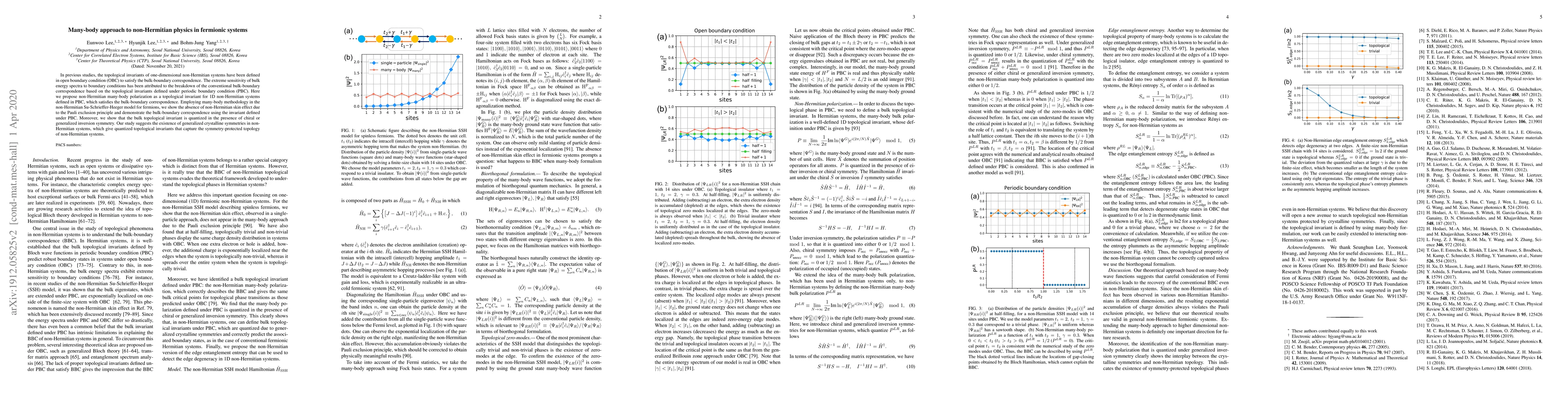 This paper proposes non-Hermitian many-body polarization as a topological invariant for 1D non-Hermitian systems under periodic boundary conditions, demonstrating bulk-boundary correspondence and the absence of the non-Hermitian skin effect due to the Pauli exclusion principle. It also shows that the topological invariant is quantized under chiral or generalized inversion symmetry, suggesting generalized crystalline symmetries in non-Hermitian systems.