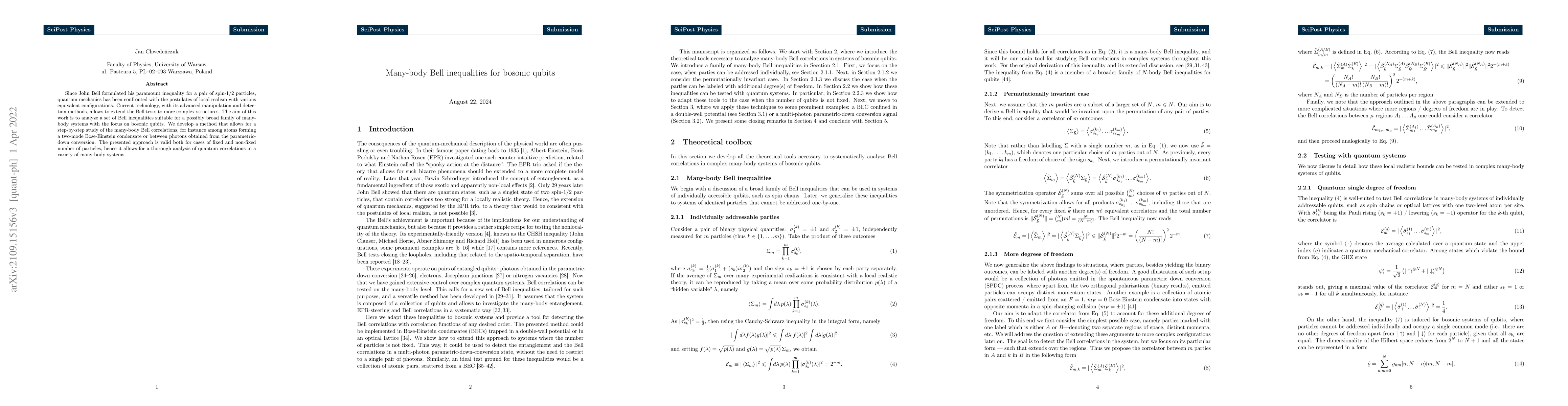 Since John Bell formulated his paramount inequality for a pair of spin-$1/2$ particles, quantum mechanics has been confronted with the postulates of local realism with various equivalent configurations. Current technology, with its advanced manipulation and detection methods, allows to extend the Bell tests to more complex structures. The aim of this work is to analyze a set of Bell inequalities suitable for a possibly broad family of many-body systems with the focus on bosonic qubits. We develop a method that allows for a step-by-step study of the many-body Bell correlations, for instance among atoms forming a two-mode Bose-Einstein condensate or between photons obtained from the parametric-down conversion. The presented approach is valid both for cases of fixed and non-fixed number of particles, hence it allows for a thorough analysis of quantum correlations in a variety of many-body systems.