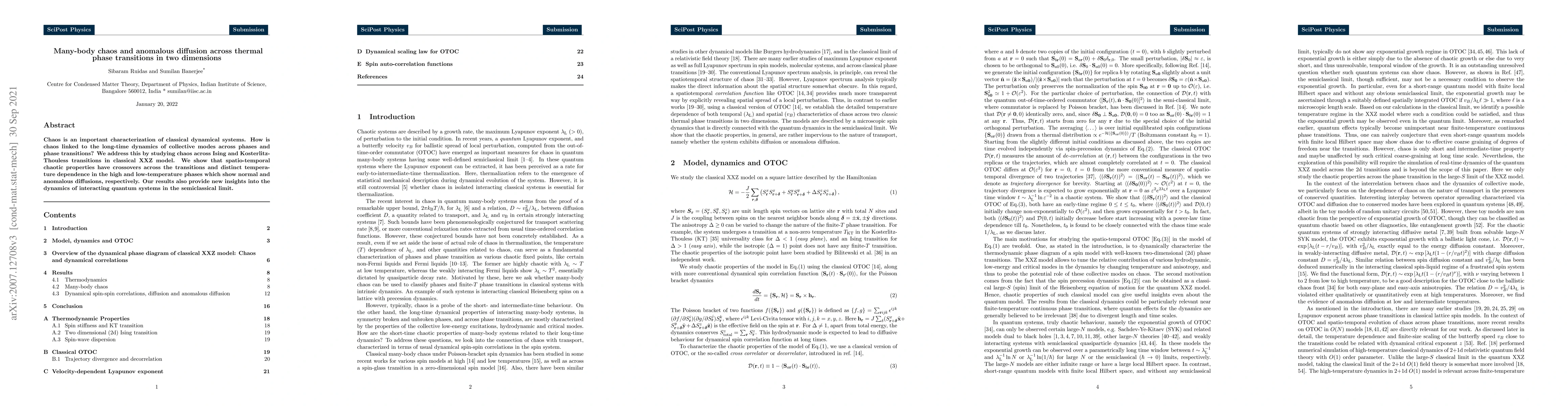 Chaos is an important characterization of classical dynamical systems. How is chaos linked to the long-time dynamics of collective modes across phases and phase transitions? We address this by studying chaos across Ising and Kosterlitz-Thouless transitions in classical XXZ model. We show that spatio-temporal chaotic properties have crossovers across the transitions and distinct temperature dependence in the high and low-temperature phases which show normal and anomalous diffusions, respectively. Our results also provide new insights into the dynamics of interacting quantum systems in the semiclassical limit.