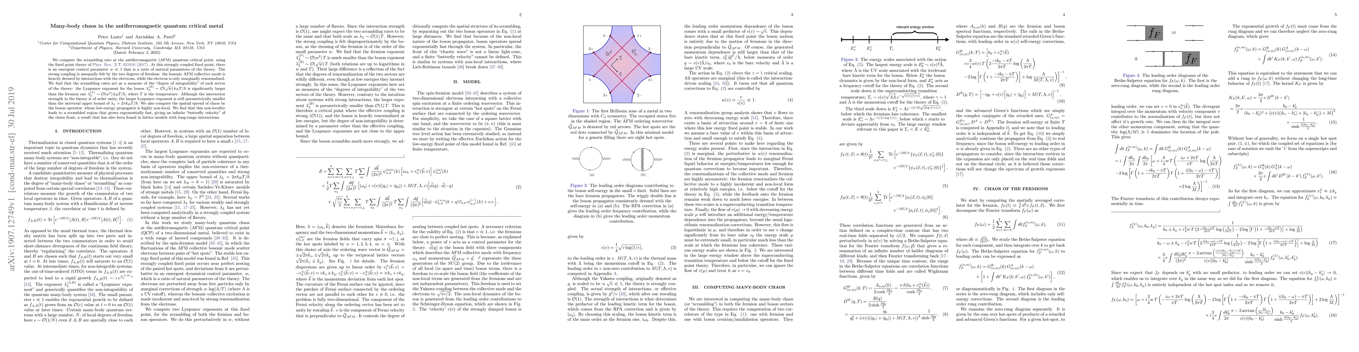 We compute the scrambling rate at the antiferromagnetic (AFM) quantum critical point, using the fixed point theory of Phys. Rev. X $\boldsymbol{7}$, 021010 (2017). At this strongly coupled fixed point, there is an emergent control parameter $w \ll 1$ that is a ratio of natural parameters of the theory. The strong coupling is unequally felt by the two degrees of freedom: the bosonic AFM collective mode is heavily dressed by interactions with the electrons, while the electron is only marginally renormalized. We find that the scrambling rates act as a measure of the "degree of integrability" of each sector of the theory: the Lyapunov exponent for the boson $\lambda_L^{(B)} \sim \mathcal O(\sqrt{w}) \,k_B T/\hbar$ is significantly larger than the fermion one $\lambda_L^{(F)} \sim \mathcal O(w^2) \,k_B T/\hbar$, where $T$ is the temperature. Although the interaction strength in the theory is of order unity, the larger Lyapunov exponent is still parametrically smaller than the universal upper bound of $\lambda_L=2\pi k_B T/\hbar$. We also compute the spatial spread of chaos by the boson operator, whose low-energy propagator is highly non-local. We find that this non-locality leads to a scrambled region that grows exponentially fast, giving an infinite "butterfly velocity" of the chaos front, a result that has also been found in lattice models with long-range interactions.