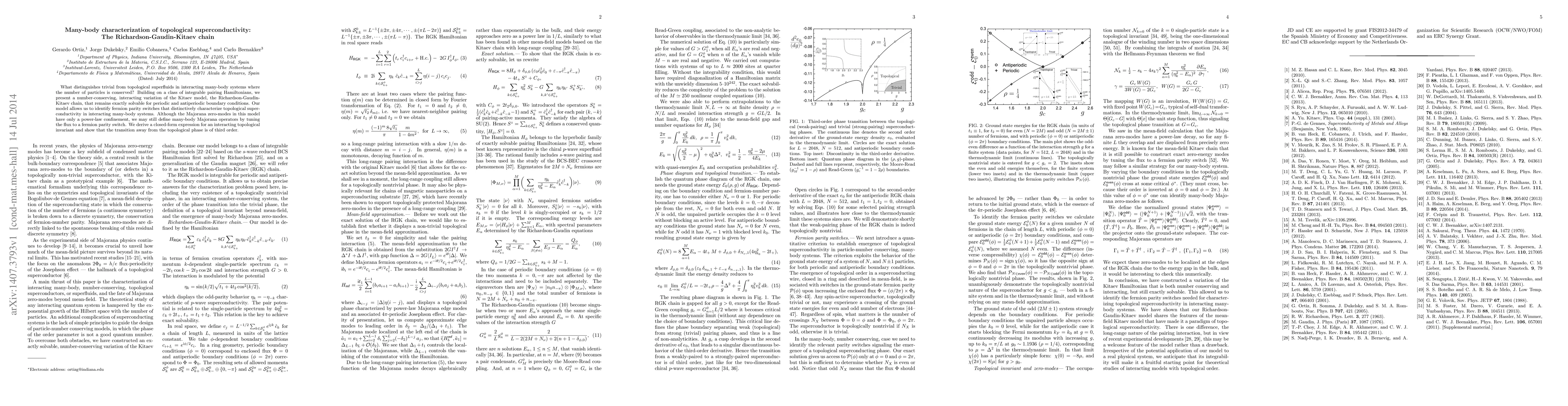 What distinguishes trivial from topological superluids in interacting many-body systems where the number of particles is conserved? Building on a class of integrable pairing Hamiltonians, we present a number-conserving, interacting variation of the Kitaev model, the Richardson-Gaudin-Kitaev chain, that remains exactly solvable for periodic and antiperiodic boundary conditions. Our model allows us to identify fermionic parity switches that distinctively characterize topological superconductivity in interacting many-body systems. Although the Majorana zero-modes in this model have only a power-law confinement, we may still define many-body Majorana operators by tuning the flux to a fermion parity switch. We derive a closed-form expression for an interacting topological invariant and show that the transition away from the topological phase is of third order.