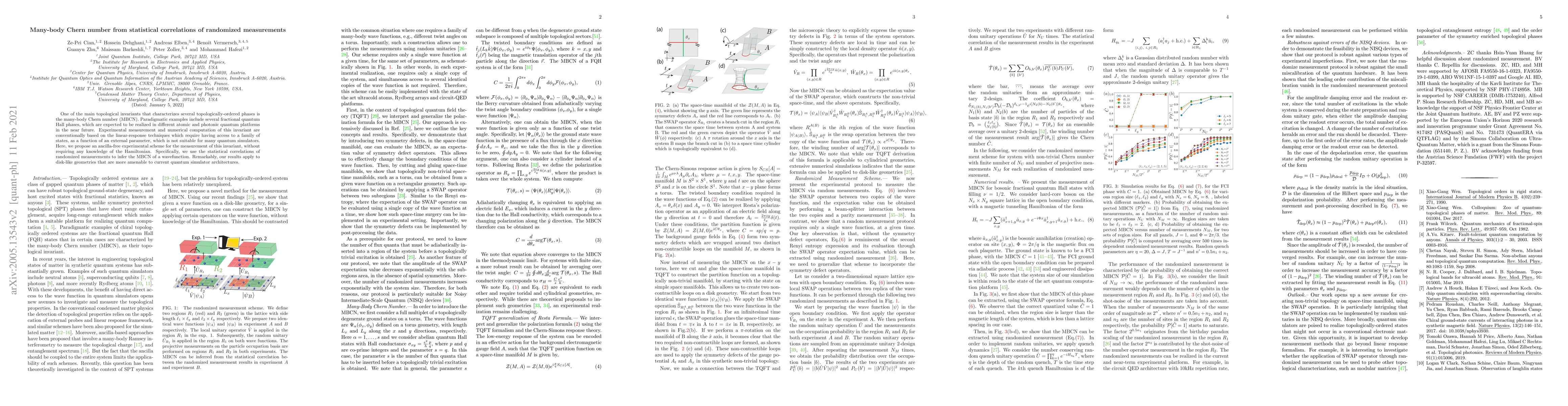 One of the main topological invariants that characterizes several topologically-ordered phases is the many-body Chern number (MBCN). Paradigmatic examples include several fractional quantum Hall phases, which are expected to be realized in different atomic and photonic quantum platforms in the near future. Experimental measurement and numerical computation of this invariant is conventionally based on the linear-response techniques which require having access to a family of states, as a function of an external parameter, which is not suitable for many quantum simulators. Here, we propose an ancilla-free experimental scheme for the measurement of this invariant, without requiring any knowledge of the Hamiltonian. Specifically, we use the statistical correlations of randomized measurements to infer the MBCN of a wavefunction. Remarkably, our results apply to disk-like geometries that are more amenable to current quantum simulator architectures.