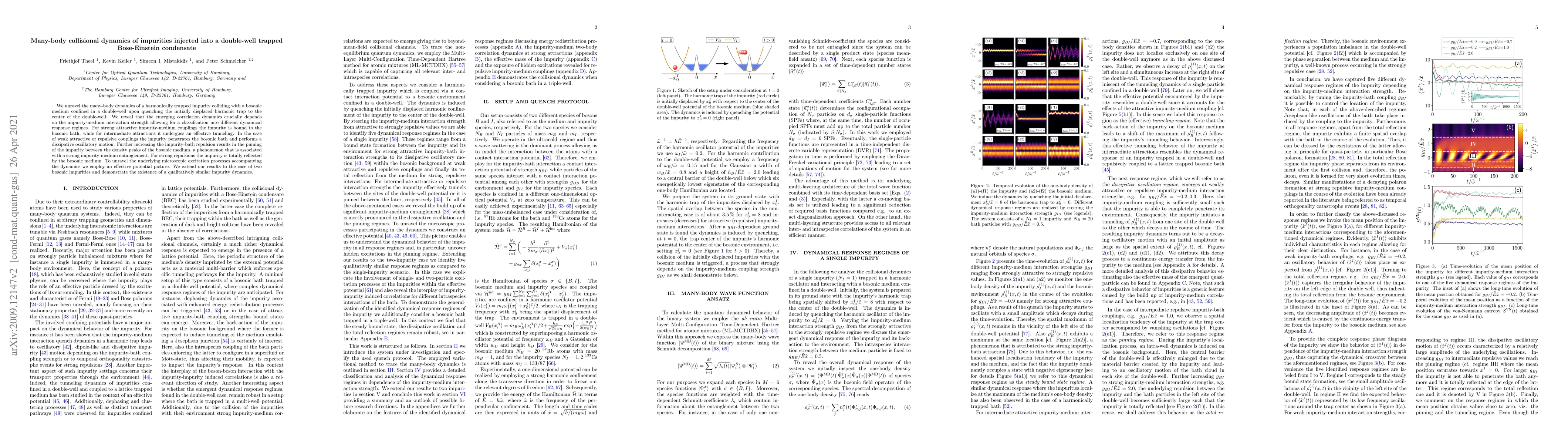 This paper investigates the many-body dynamics of impurities in a double-well trapped Bose-Einstein condensate, revealing distinct regimes based on impurity-medium interaction strength, including bound states, tunneling, oscillatory motion, and reflection. The study also extends findings to two impurities.