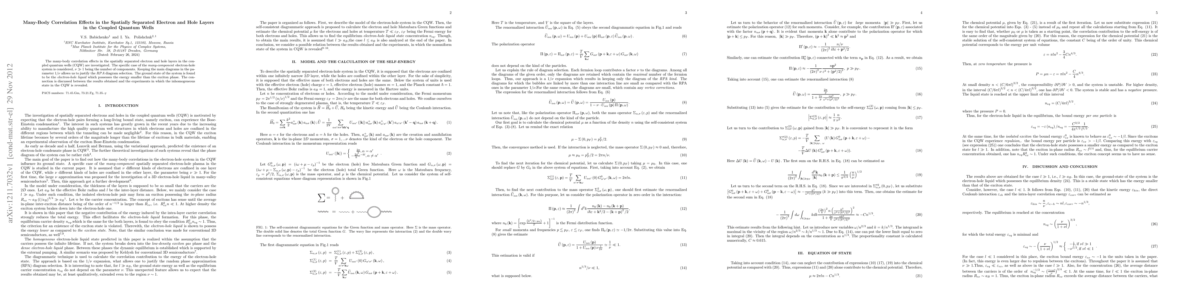 The many-body correlation effects in the spatially separated electron and hole layers in the coupled quantum wells are investigated. The specific case of the many-component electron-hole system is considered. Keeping the main diagrams in the parameter of the inverse number of components allows us to justify the RPA diagram selection. The ground state of the system is found to be the electron-hole liquid which possesses the energy smaller than the exciton phase. The connection is discussed between the results obtained and the experiments in which the inhomogeneous state in the coupled quantum wells is revealed.