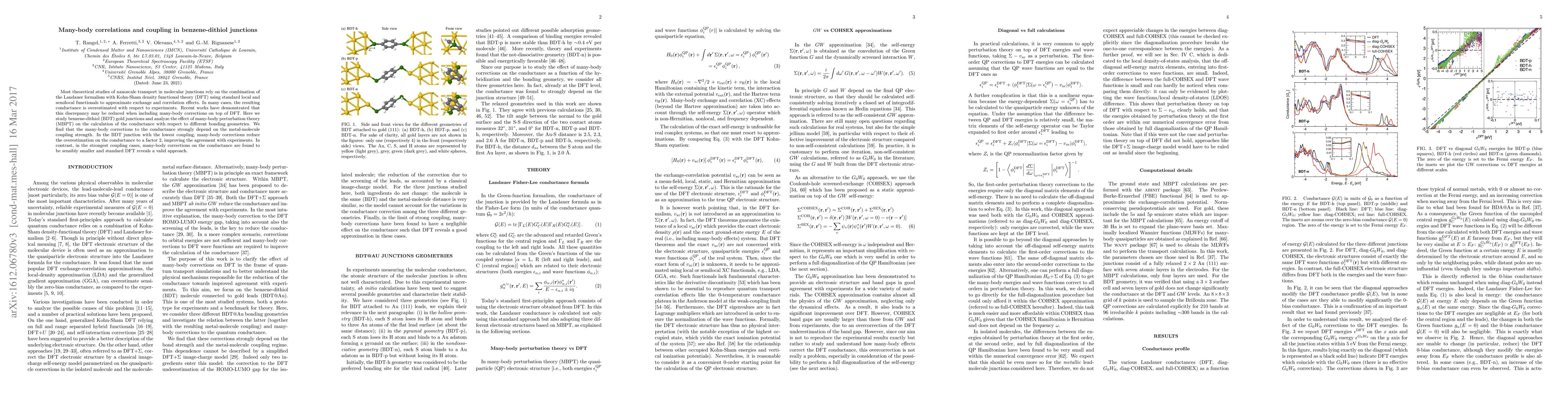 A study on benzene-dithiol gold junctions found that many-body corrections improve conductance predictions when metal-molecule coupling is weak, but have little effect in strong coupling cases.