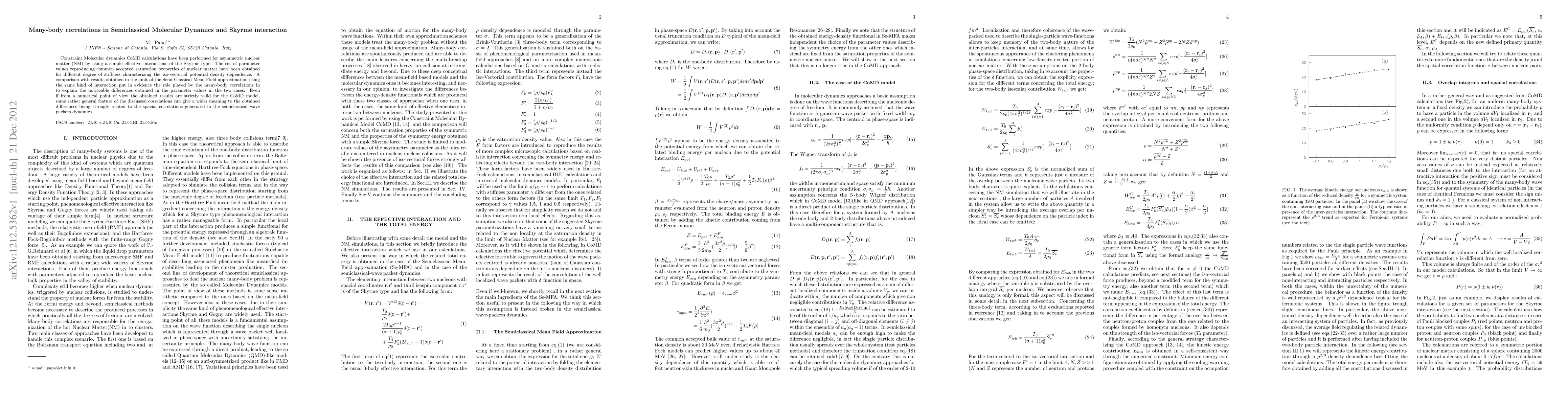 Constraint Molecular dynamics CoMD calculations have been performed for asymmetric nuclear matter (NM) by using a simple effective interactions of the Skyrme type. The set of parameter values reproducing common accepted saturation properties of nuclear matter have been obtained for different degree of stiffness characterizing the iso-vectorial potential density dependence. A comparison with results obtained in the limit of the Semi-Classical Mean Field approximation using the same kind of interaction put in evidence the role played by the many-body correlations in to explain the noticeable differences obtained in the parameter values in the two cases. Even if from a numerical point of view the obtained results are strictly valid for the CoMD model, some rather general feature of the discussed correlations can give a wider meaning to the obtained differences being strongly related to the spacial correlations generated in the semiclassical wave packets dynamics.