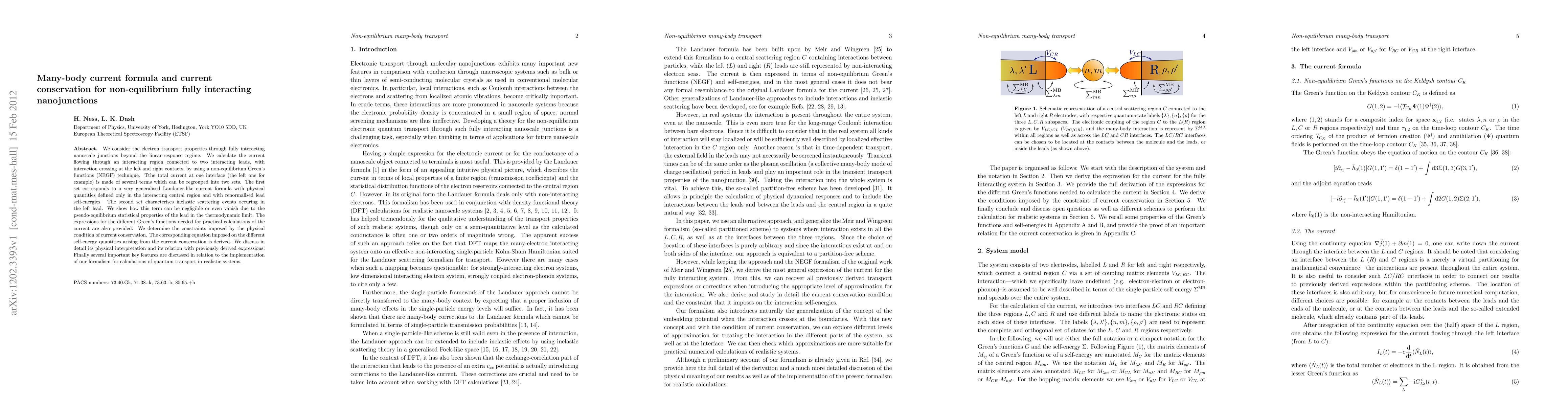 This paper develops a many-body current formula for non-equilibrium electron transport in fully interacting nanoscale junctions, using non-equilibrium Green's functions. It shows how current conservation constraints can be derived and discusses the significance of inelastic scattering events in the leads.