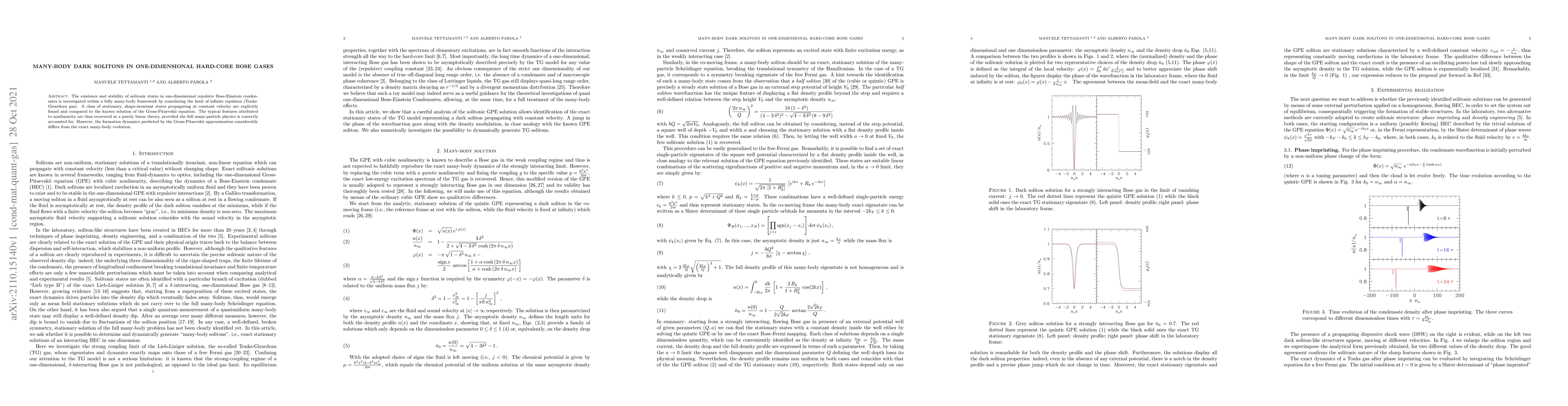 The existence and stability of solitonic states in one-dimensional repulsive Bose-Einstein condensates is investigated within a fully many-body framework by considering the limit of infinite repulsion (Tonks-Girardeau gas). A class of stationary, shape-invariant states propagating at constant velocity are explicitly found and compared to the known solution of the Gross-Pitaevskii equation. The typical features attributed to nonlinearity are thus recovered in a purely linear theory, provided the full many-particle physics is correctly accounted for. However, the formation dynamics predicted by the Gross-Pitaevskii approximation considerably differs from the exact many-body evolution.