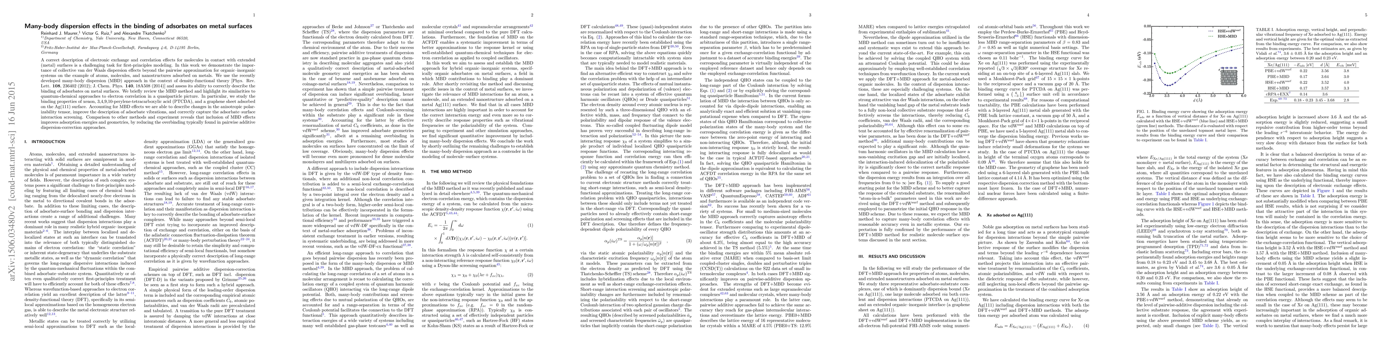 This paper demonstrates the significance of many-body dispersion (MBD) effects in accurately modeling the binding of adsorbates on metal surfaces, using the MBD approach within density-functional theory. It shows that MBD improves the description of adsorbate-surface interactions, binding energies, and geometries compared to pairwise dispersion corrections.
