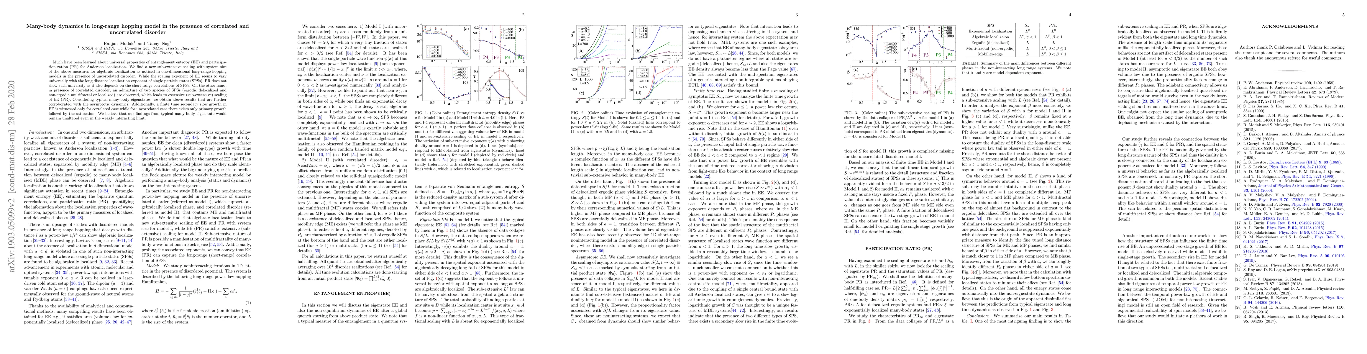 Much have been learned about universal properties of entanglement entropy (EE) and participation ration (PR) for Anderson localization. We find a new sub-extensive scaling with system size of the above measures for algebraic localization as noticed in one-dimensional long-range hopping models in the presence of uncorrelated disorder. While the scaling exponent of EE seems to vary universally with the long distance localization exponent of single particle states (SPSs), PR does not show such university as it also depends on the short range correlations of SPSs. On the other hand, in presence of correlated disorder, an admixture of two species of SPSs (ergodic delocalized and non-ergodic multifractal or localized) are observed, which leads to extensive (sub-extensive) scaling of EE (PR). Considering typical many-body eigenstates, we obtain above results that are further corroborated with the asymptotic dynamics. Additionally, a finite time secondary slow growth in EE is witnessed only for correlated case while for uncorrelated case there exists only primary growth followed by the saturation. We believe that our findings from typical many-body eigenstate would remain unaltered even in the weakly interacting limit.