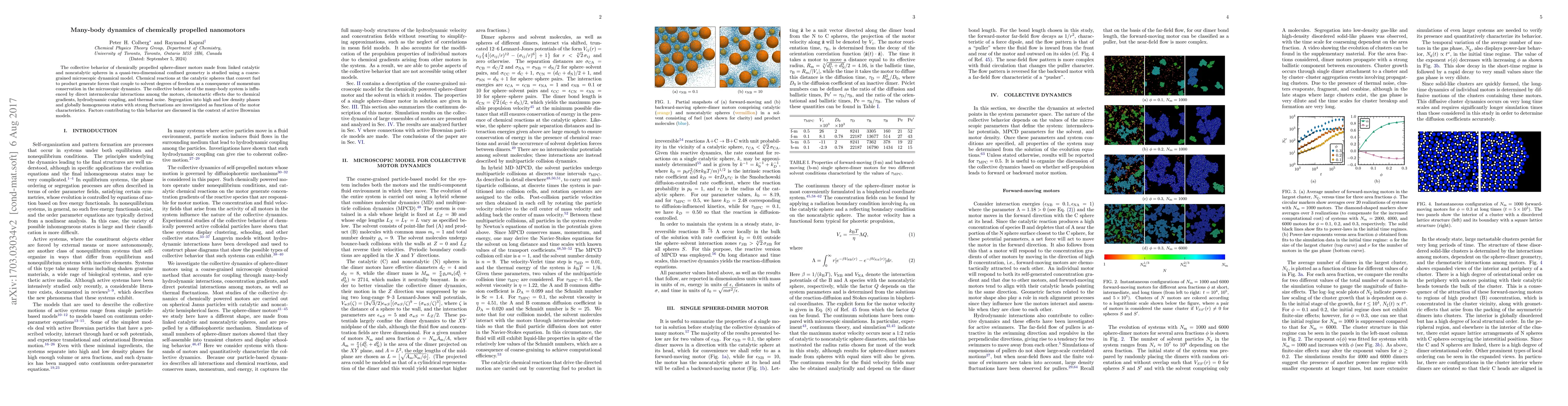 The development and application of a coarse-grained microscopic dynamical model to study the collective behavior of chemically propelled sphere-dimer motors in confined geometries.