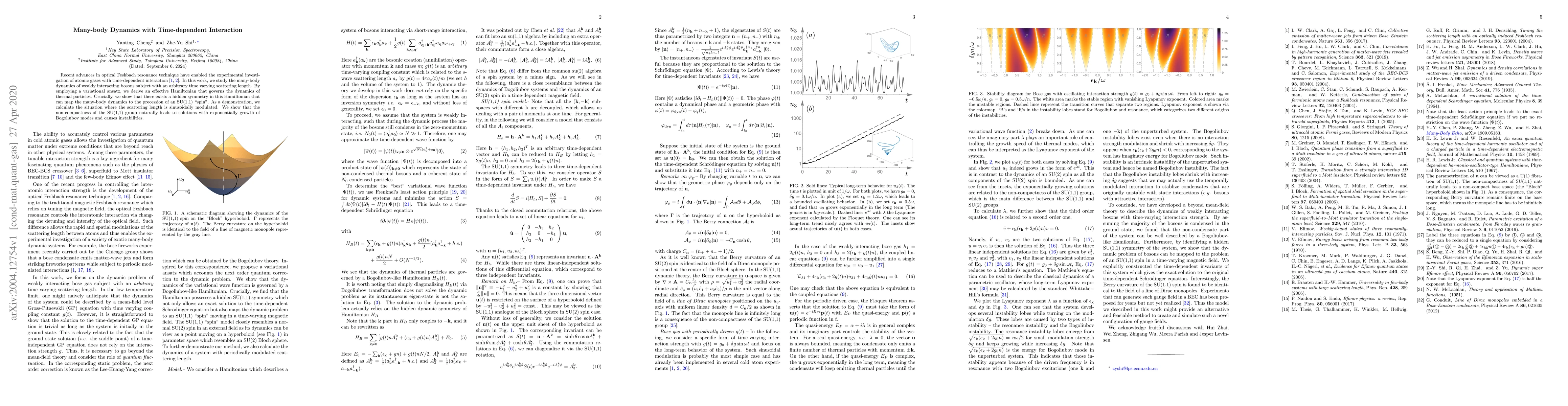 This research derives an effective Hamiltonian for many-body dynamics of weakly interacting bosons with time-varying scattering length, revealing a hidden SU(1,1) 'spin' symmetry. It demonstrates that non-compactness of SU(1,1) causes instabilities, as seen in sinusoidally modulated scattering length scenarios.
