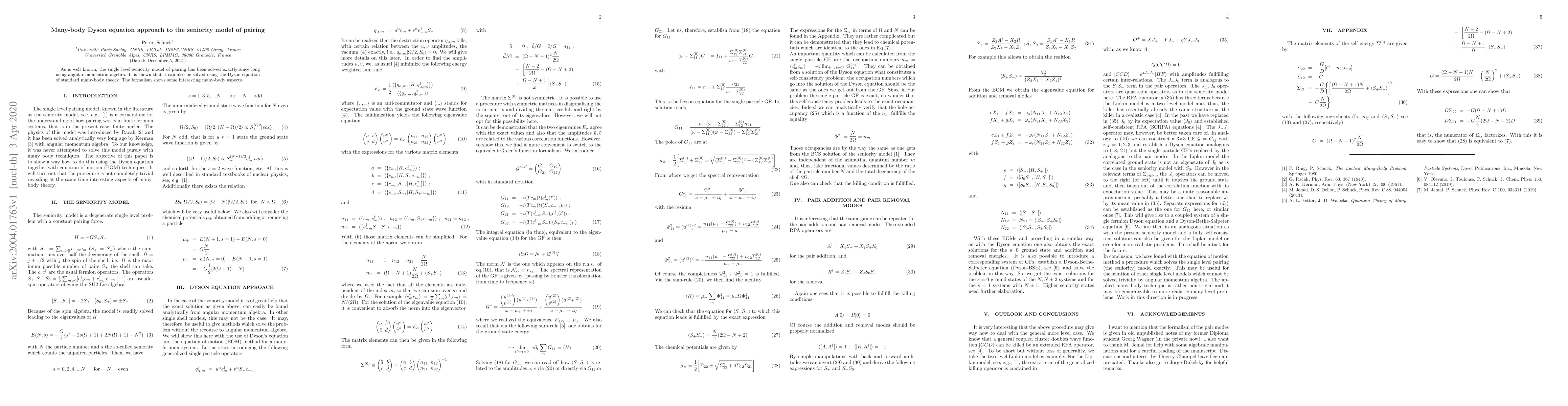 This paper demonstrates that the single level seniority model of pairing, traditionally solved using angular momentum algebra, can also be addressed through the many-body Dyson equation approach, revealing intriguing many-body dynamics.