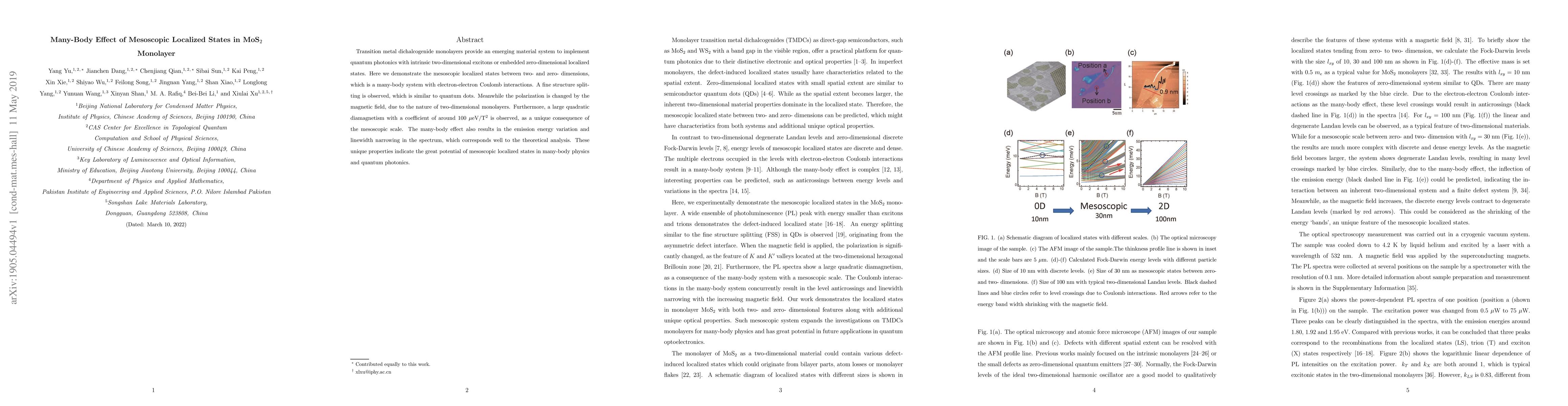 Transition metal dichalcogenide monolayers provide an emerging material system to implement quantum photonics with intrinsic two-dimensional excitons or embedded zero-dimensional localized states. Here we demonstrate the mesoscopic localized states between two- and zero- dimensions, which is a many-body system with electron-electron Coulomb interactions. A fine structure splitting is observed, which is similar to quantum dots. Meanwhile the polarization is changed by the magnetic field, due to the nature of two-dimensional monolayers. Furthermore, a large quadratic diamagnetism with a coefficient of around $100\ \mathrm{\mu eV/T^2}$ is observed, as a unique consequence of the mesoscopic scale. The many-body effect also results in the emission energy variation and linewidth narrowing in the spectrum, which corresponds well to the theoretical analysis. These unique properties indicate the great potential of mesoscopic localized states in many-body physics and quantum photonics.