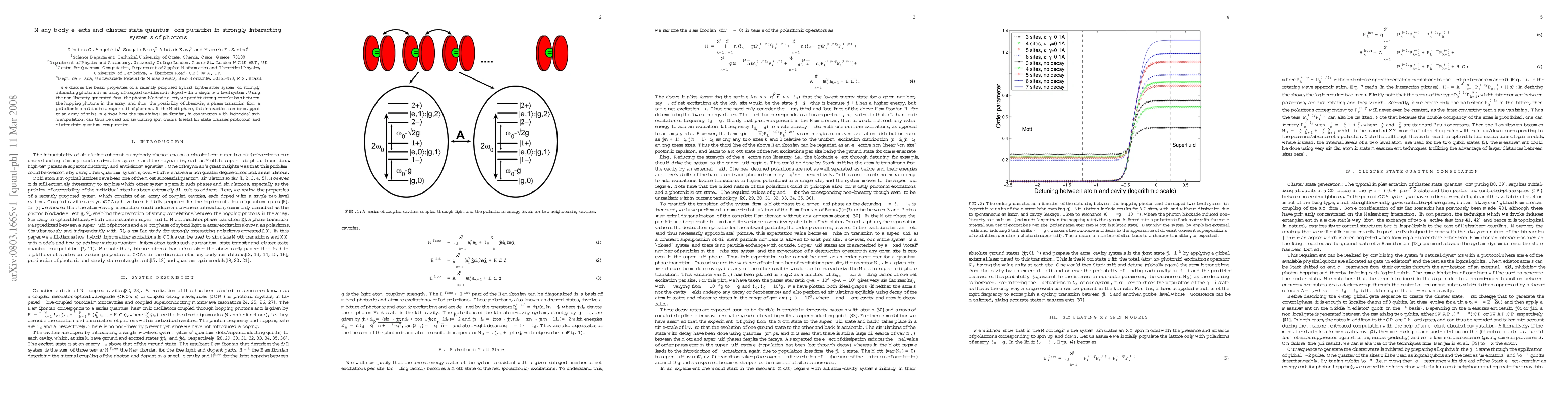 This paper explores a hybrid light-matter system of strongly interacting photons in coupled cavities with two-level systems, predicting strong photon correlations and a phase transition to a photon superfluid. The system can simulate spin chains and enable cluster state quantum computation using the photon-matter interaction.