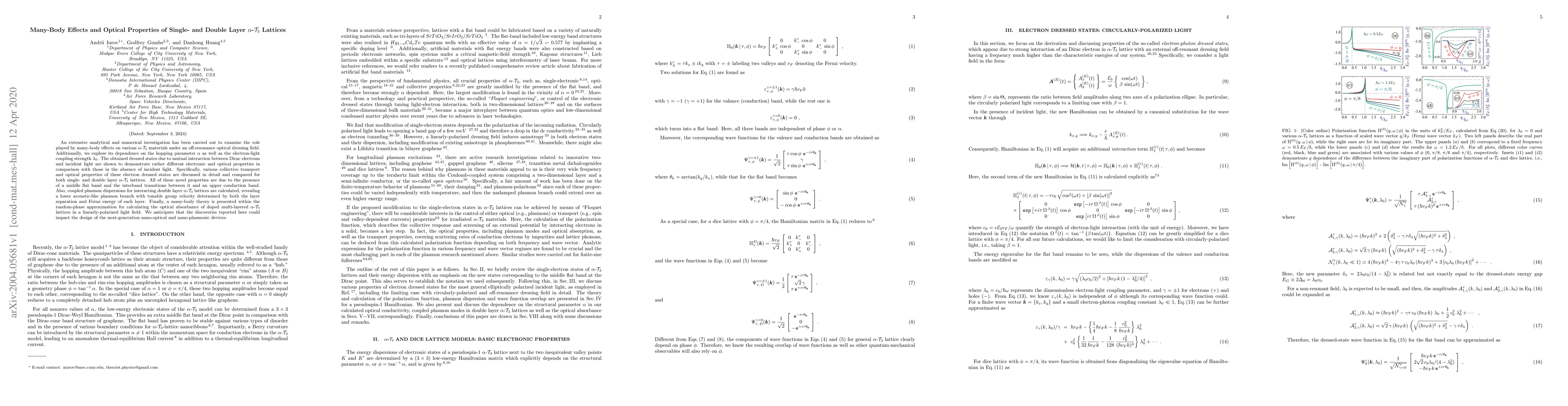An extensive analytical and numerical investigation has been carried out to examine the role played by many-body effects on various $\alpha$-$\mathcal{T}_3$ materials under an off-resonance optical dressing field. Additionally, we explore its dependence on the hopping parameter $\alpha$ as well as the electron-light coupling strength $\lambda_0$. The obtained dressed states due to mutual interaction between Dirac electrons and incident light are shown to demonstrate rather different electronic and optical properties in comparison with those in the absence of incident light. Specifically, various collective transport and optical properties of these electron dressed states are discussed in detail and compared for both single- and double layer $\alpha$-$\mathcal{T}_3$ lattices. All of these novel properties are due to the presence of a middle flat band and the interband transitions between it and an upper conduction band. Also, coupled plasmon dispersions for interacting double layer $\alpha$-$\mathcal{T}_3$ lattices are calculated, revealing a lower acoustic-like plasmon branch with tunable group velocity determined by both the layer separation and Fermi energy of each layer. Finally, a many-body theory is presented within the random-phase approximation for calculating the optical absorbance of doped multi-layered $\alpha$-$\mathcal{T}_3$ lattices in a linearly-polarized light field. We anticipate that the discoveries reported here could impact the design of the next-generation nano-optical and nano-plasmonic devices.