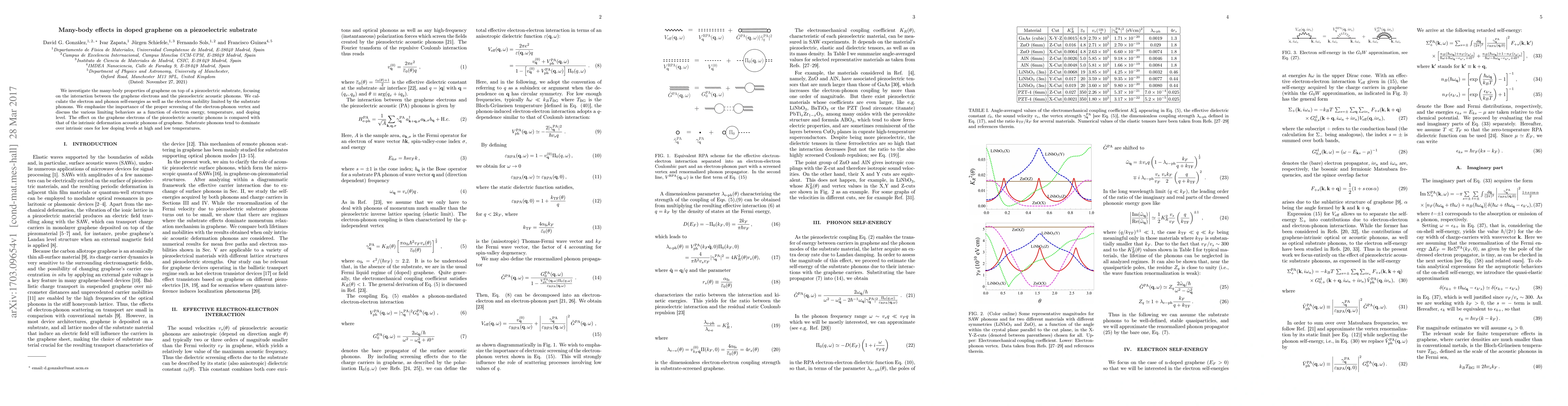 This paper examines the many-body interactions in doped graphene on a piezoelectric substrate, highlighting the influence of substrate phonons on electron mobility and self-energy. It reveals that substrate phonons dominate intrinsic phonons at low doping levels, affecting electron behavior significantly.