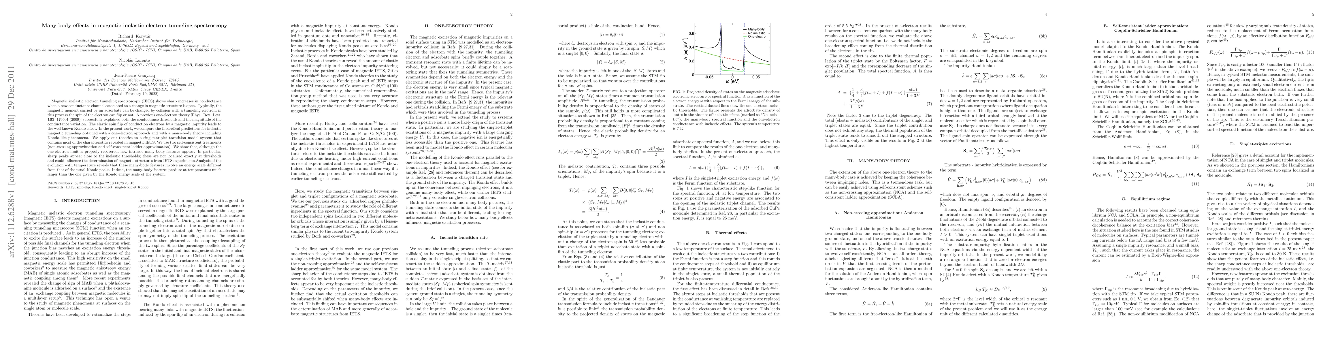 Magnetic inelastic electron tunneling spectroscopy (IETS) shows sharp increases in conductance when a new conductance channel associated to a change in magnetic structure is open. Typically, the magnetic moment carried by an adsorbate can be changed by collision with a tunneling electron; in this process the spin of the electron can flip or not. A previous one-electron theory [Phys. Rev. Lett. {\bf 103}, 176601 (2009)] successfully explained both the conductance thresholds and the magnitude of the conductance variation. The elastic spin flip of conduction electrons by a magnetic impurity leads to the well known Kondo effect. In the present work, we compare the theoretical predictions for inelastic magnetic tunneling obtained with a one-electron approach and with a many-body theory including Kondo-like phenomena. We apply our theories to a singlet-triplet transition model system that contains most of the characteristics revealed in magnetic IETS. We use two self-consistent treatments (non-crossing approximation and self-consistent ladder approximation). We show that, although the one-electron limit is properly recovered, new intrinsic many-body features appear. In particular, sharp peaks appear close to the inelastic thresholds; these are not localized exactly at thresholds and could influence the determination of magnetic structures from IETS experiments.Analysis of the evolution with temperature reveals that these many-body features involve an energy scale different from that of the usual Kondo peaks. Indeed, the many-body features perdure at temperatures much larger than the one given by the Kondo energy scale of the system.