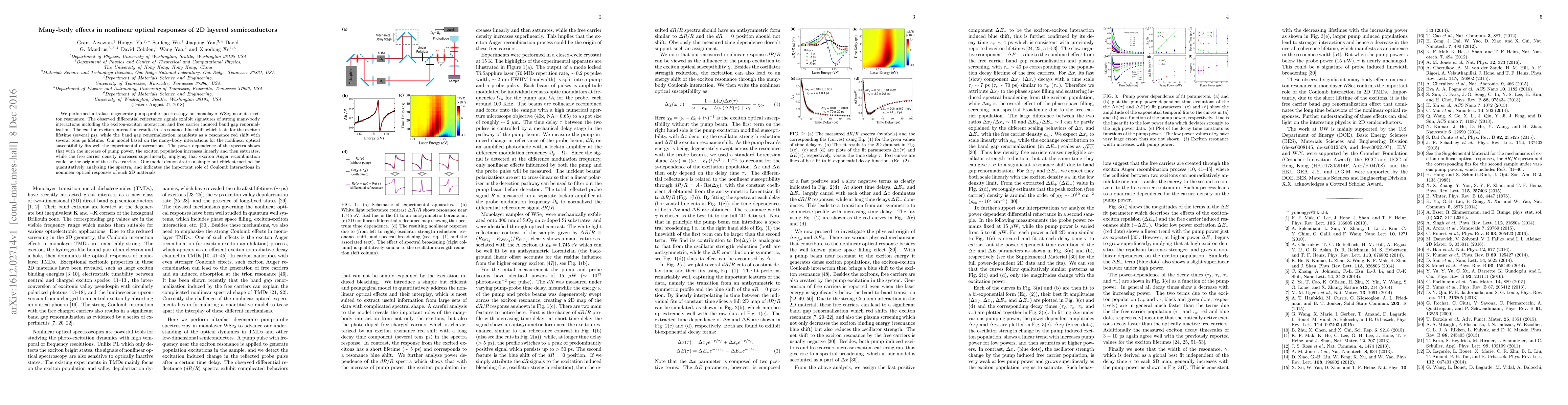 This paper investigates many-body effects in the nonlinear optical responses of monolayer WSe2 using ultrafast spectroscopy, revealing exciton-exciton interactions and band gap renormalization due to free carriers. The study shows that exciton population saturates while free carrier density increases superlinearly with pump power, suggesting exciton Auger recombination.