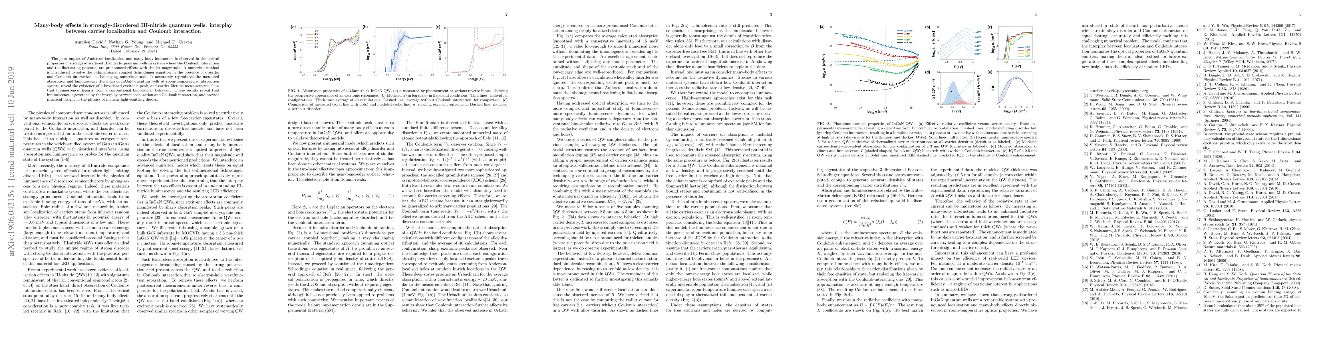 The joint impact of Anderson localization and many-body interaction is observed in the optical properties of strongly-disordered III-nitride quantum wells, a system where the Coulomb interaction and the fluctuating potential are pronounced effects with similar magnitude. A numerical method is introduced to solve the 6-dimensional coupled Schrodinger equation in the presence of disorder and Coulomb interaction, a challenging numerical task. It accurately reproduces the measured absorption and luminescence dynamics of InGaN quantum wells at room-temperature: absorption spectra reveal the existence of a broadened excitonic peak, and carrier lifetime measurements show that luminescence departs from a conventional bimolecular behavior. These results reveal that luminescence is governed by the interplay between localization and Coulomb interaction, and provide practical insight in the physics of modern light-emitting diodes.