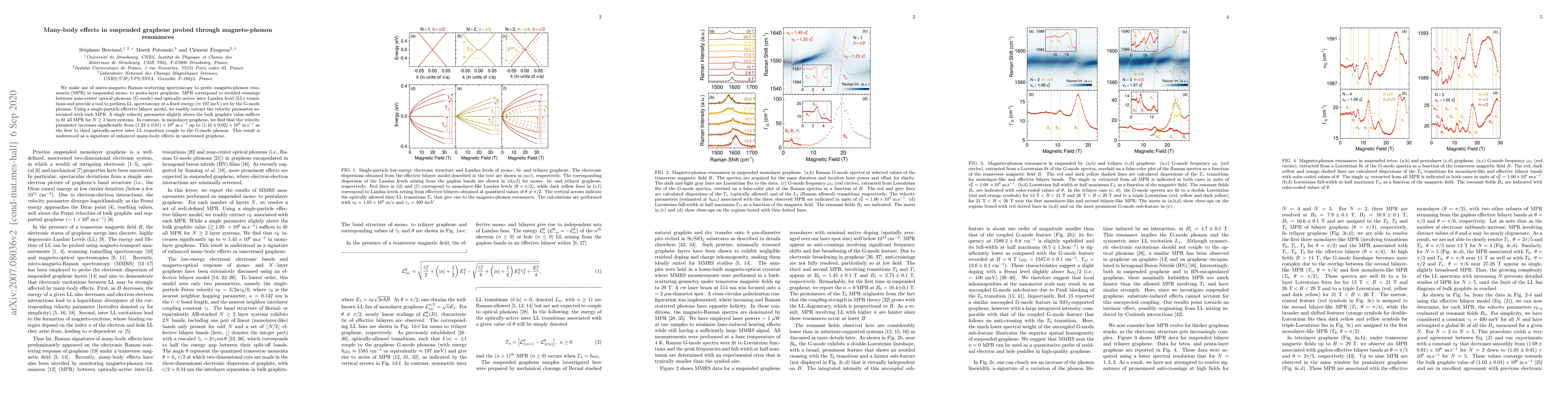 This research uses micro-magneto Raman scattering spectroscopy to investigate magneto-phonon resonances in suspended graphene, revealing that many-body effects significantly enhance the velocity parameter in monolayer graphene compared to bilayer and thicker layers.