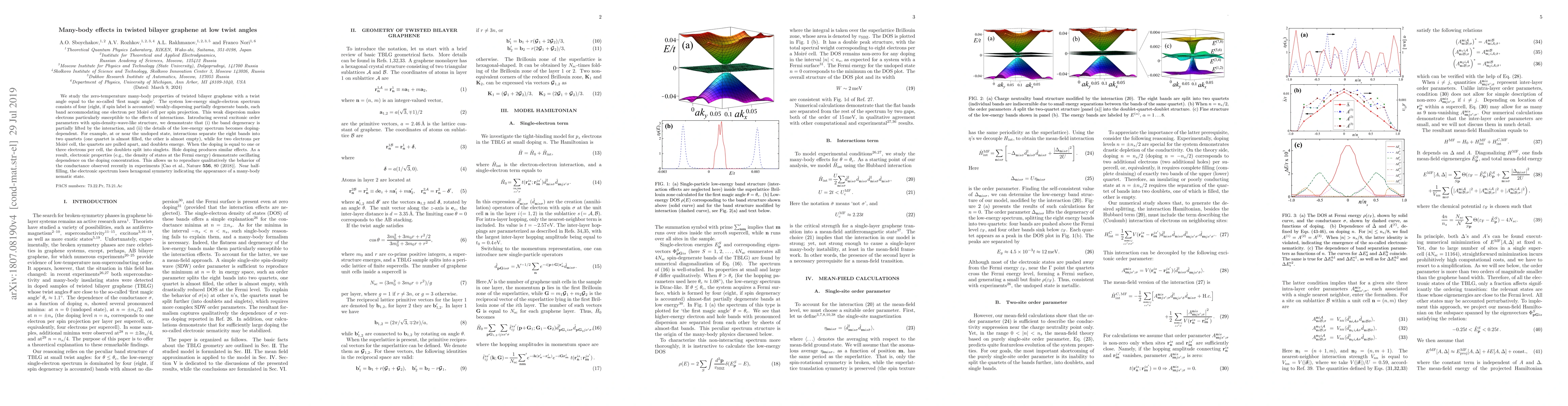 We study the zero-temperature many-body properties of twisted bilayer graphene with a twist angle equal to the so-called `first magic angle'. The system low-energy single-electron spectrum consists of four (eight, if spin label is accounted) weakly-dispersing partially degenerate bands, each band accommodating one electron per Moir{\'{e}} cell per spin projection. This weak dispersion makes electrons particularly susceptible to the effects of interactions. Introducing several excitonic order parameters with spin-density-wave-like structure, we demonstrate that (i)~the band degeneracy is partially lifted by the interaction, and (ii)~the details of the low-energy spectrum becomes doping-dependent. For example, at or near the undoped state, interactions separate the eight bands into two quartets (one quartet is almost filled, the other is almost empty), while for two electrons per Moir\'{e} cell, the quartets are pulled apart, and doublets emerge. When the doping is equal to one or three electrons per cell, the doublets split into singlets. Hole doping produces similar effects. As a result, electronic properties (e.g., the density of states at the Fermi energy) demonstrate oscillating dependence on the doping concentration. This allows us to reproduce qualitatively the behavior of the conductance observed recently in experiments [Cao et al., Nature {\bf 556}, 80 (2018)]. Near half-filling, the electronic spectrum loses hexagonal symmetry indicating the appearance of a many-body nematic state.