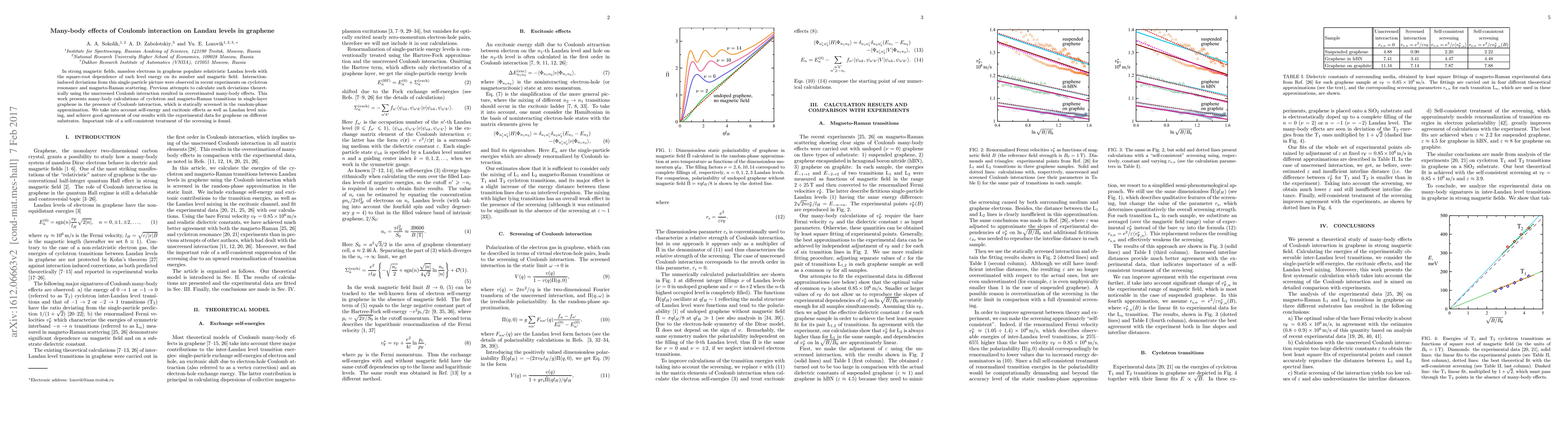 This paper studies the many-body effects of Coulomb interaction on Landau levels in graphene under strong magnetic fields, providing accurate calculations of cyclotron and magneto-Raman transitions. The researchers account for self-energy, excitonic effects, and Landau level mixing, achieving agreement with experimental data and emphasizing the importance of self-consistent screening.