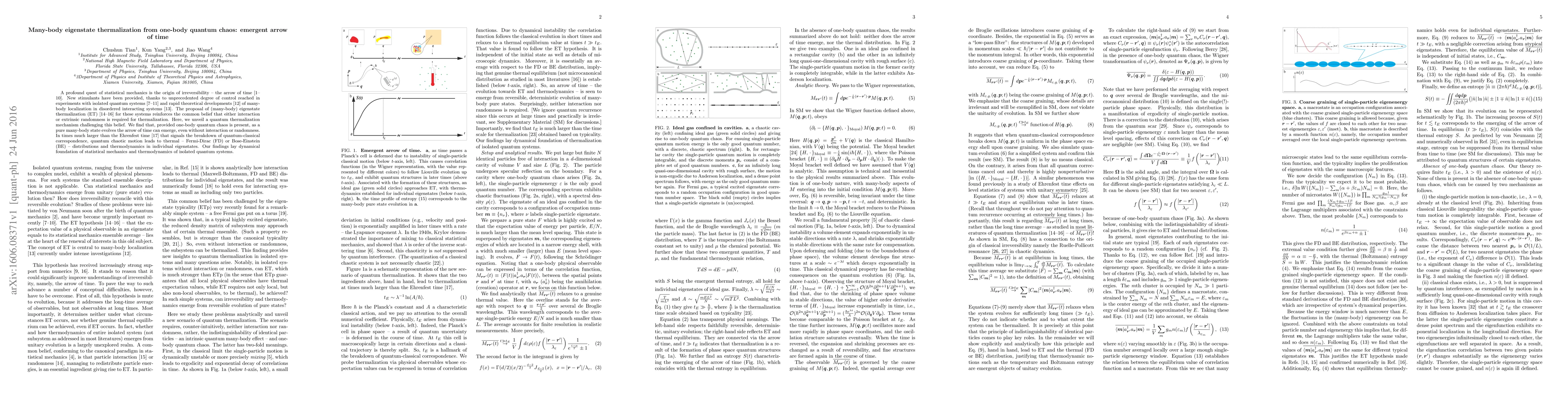 A profound quest of statistical mechanics is the origin of irreversibility - the arrow of time. New stimulants have been provided, thanks to unprecedented degree of control reached in experiments with isolated quantum systems and rapid theoretical developments of manybody localization in disordered interacting systems. The proposal of (many-body) eigenstate thermalization (ET) for these systems reinforces the common belief that either interaction or extrinsic randomness is required for thermalization. Here, we unveil a quantum thermalization mechanism challenging this belief. We find that, provided one-body quantum chaos is present, as a pure many-body state evolves the arrow of time can emerge, even without interaction or randomness. In times much larger than the Ehrenfest time that signals the breakdown of quantum-classical correspondence, quantum chaotic motion leads to thermal [Fermi-Dirac (FD) or Bose-Einstein (BE)] distributions and thermodynamics in individual eigenstates. Our findings lay dynamical foundation of statistical mechanics and thermodynamics of isolated quantum systems.