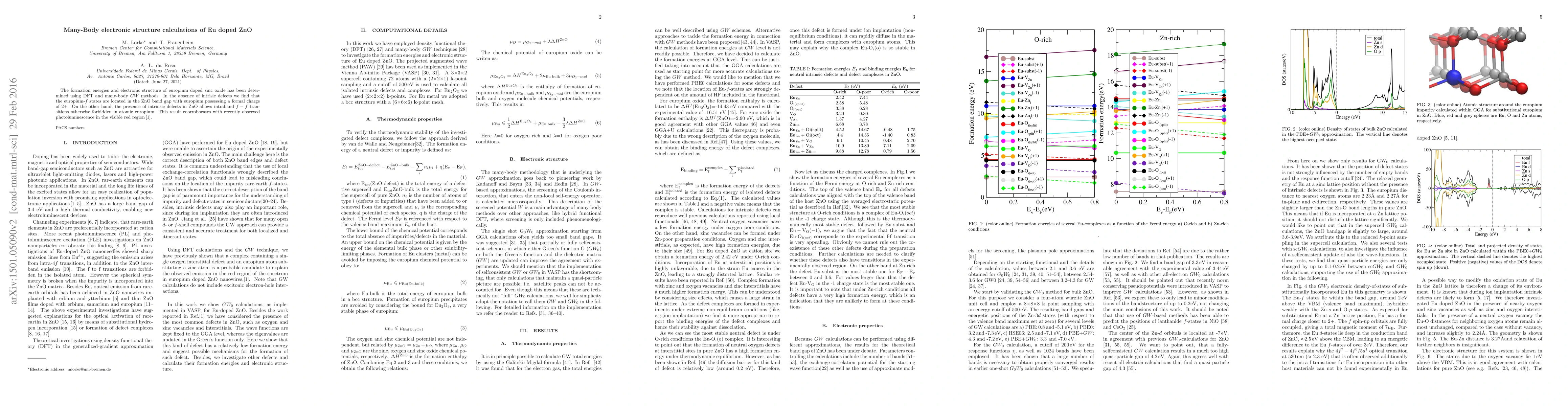 This paper investigates the electronic structure of europium-doped zinc oxide using DFT and many-body $GW$ methods, finding europium-$f$ states in the ZnO band gap. It also shows that intrinsic defects enable intraband $f-f$ transitions, corroborating observed visible red photoluminescence.