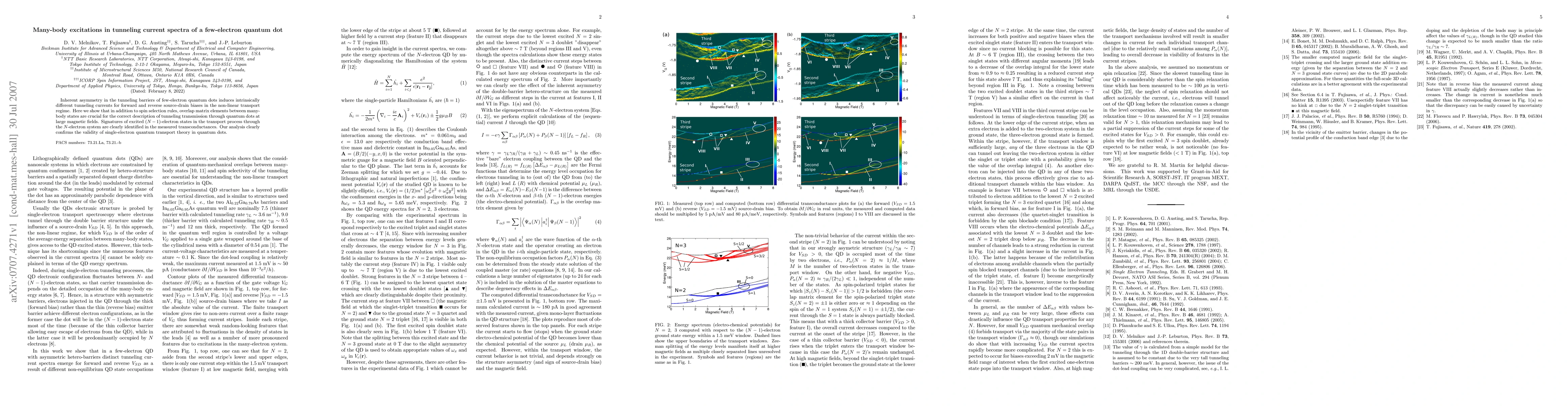 This paper investigates the tunneling current in few-electron quantum dots, revealing that many-body state overlaps significantly affect tunneling transmission under large magnetic fields. The study identifies signatures of excited states in transconductance measurements, confirming the applicability of single-electron quantum transport theory.
