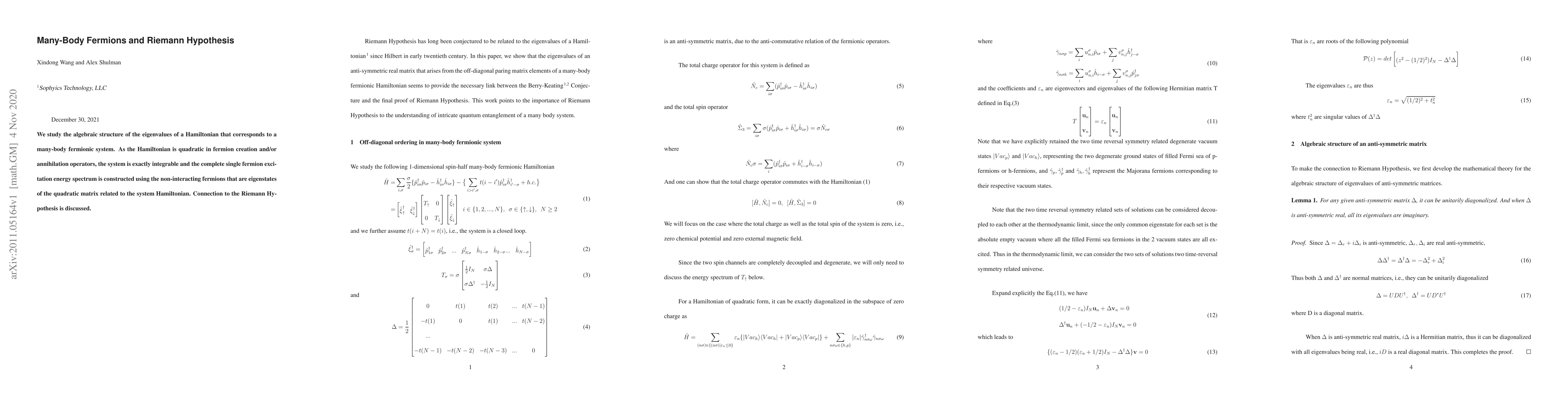 We study the algebraic structure of the eigenvalues of a Hamiltonian that corresponds to a many-body fermionic system. As the Hamiltonian is quadratic in fermion creation and/or annihilation operators, the system is exactly integrable and the complete single fermion excitation energy spectrum is constructed using the non-interacting fermions that are eigenstates of the quadratic matrix related to the system Hamiltonian. Connection to the Riemann Hypothesis is discussed.