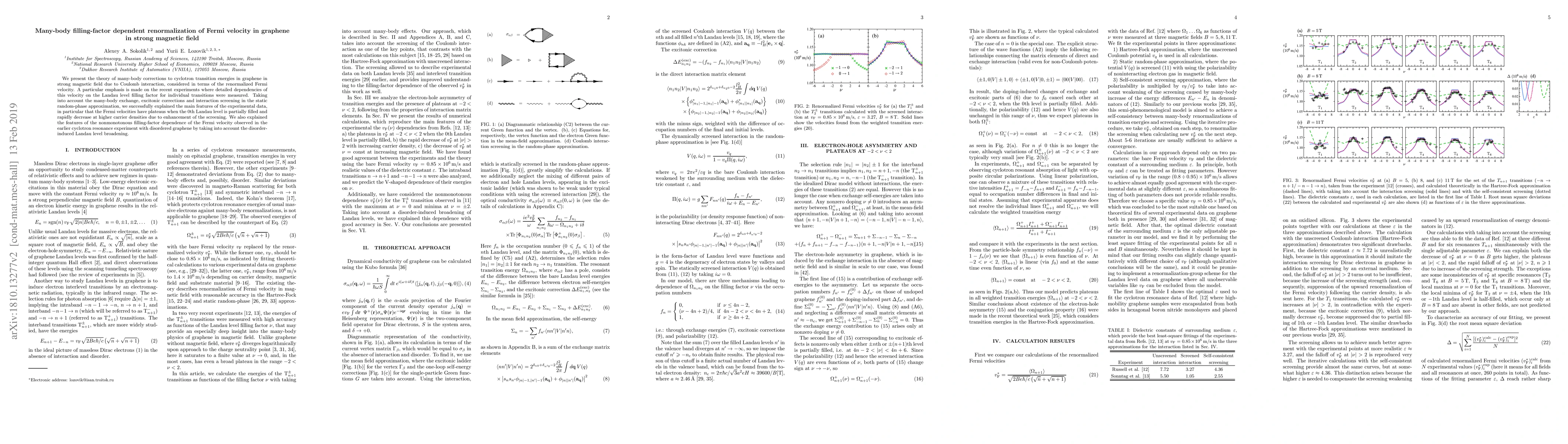 This paper develops a theoretical framework for many-body corrections to cyclotron transition energies in graphene under strong magnetic fields, focusing on the renormalization of Fermi velocity due to Coulomb interactions. It explains experimental observations of Fermi velocity plateaus and decreases through many-body effects, excitonic corrections, and disorder-induced broadening.